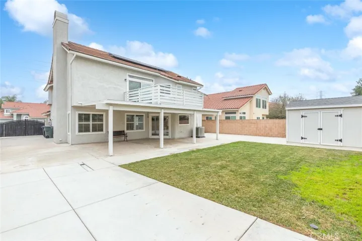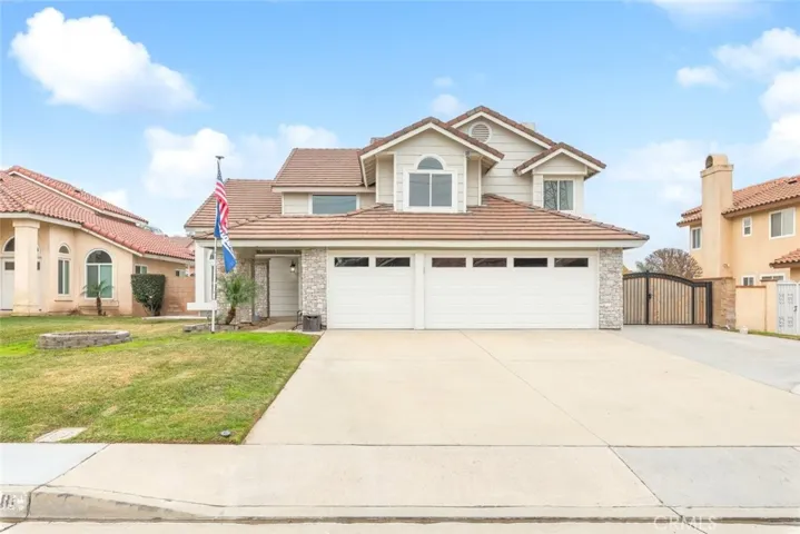 Your Search Is Over! No HOA! Low Property Tax! Paid Solar! Downstairs Full Bed and Full Bath! Gated RV Parking! Extra Large Driveway! Gorgeous Kitchen! Remodeled Baths! Soaring Ceilings! Large Yard! Great Layout! Excellent Curb Appeal! And much more to love… From the moment you step foot into this home, you’ll know it’s the one! Be greeted by mahogany double doors, a tiled entry, and wood plank floors. A gorgeous stairwell with wrought-iron balusters and wainscoting in the formal living and formal dining room is tastefully done. Window shutters and tons of natural light add a bright and grand feel. Continue into the beautifully remodeled kitchen where you’ll find white cabinets, quartz counters, a full tile backsplash, a white farmhouse sink, stainless steel appliances, and a large butcher block island with breakfast bar seating and pendant lights. A picture window above kitchen sink faces the rear yard as a bonus. The kitchen flows into the family room where a brick fireplace and wood mantel provide an attractive visual anchor. Crown molding, door casings, and window shutters give this room an extra polish that you’ll love. Downstairs you’ll also find a Full Bedroom, a remodeled Full Bathroom, and an inside laundry room w/direct access to the 3-car garage. Heading upstairs, make sure to notice the picture window highlighting local mountains in the distance. In the winter, they’re snow-capped. Upstairs you’ll see double doors that lead into a large primary bedroom with high ceilings, a slider to access the supersized balcony, dual walk-in closets, and a remodeled dual-sink bathroom with tiled standing shower and separate soaker tub. Rounding out the upstairs you’ll find 3 more perfectly sized bedrooms that share a remodeled dual-sink hallway bathroom. With a total of 5 beds and 3 full baths, there’s room for the entire family. Outside, you’ll find a sizable covered patio, large grass area, block wall and concrete hardscape around the entire perimeter, and a storage shed to keep things organized. Also, Wow! Endless Gated RV Parking at side yard, with plenty of non-gated parking at front driveway. Space for multiple RVs, Boats, Toy Haulers, Work Trucks, etc. A home with this much RV access is hard to find! Don’t miss out. This amazing home checks all the right boxes. Get scheduled to tour this home asap before it’s gone.