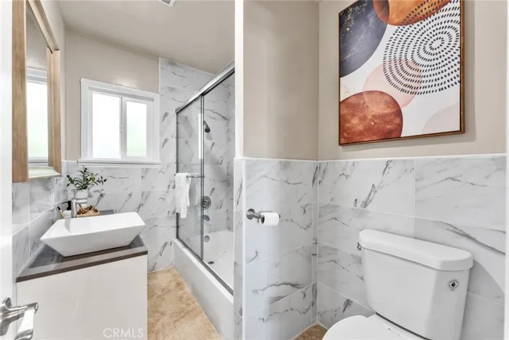 The inviting living room is enhanced by a large picture “view” window, filling the space with natural light and creating an airy, open feel as it flows into the dining area. The refreshed kitchen offers sleek cabinetry, quartz-style countertops, and a gas range. Bathrooms have been tastefully updated, including a remodeled full bath with marble-look wall tile, modern vanity, and a glass-enclosed tub/shower. The primary bedroom is enhanced by impressive built-in wardrobe storage and open shelving, creating a clean, organized, boutique-style feel.