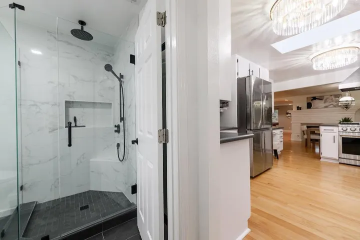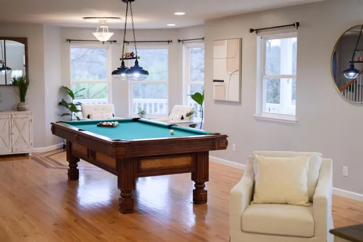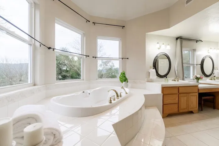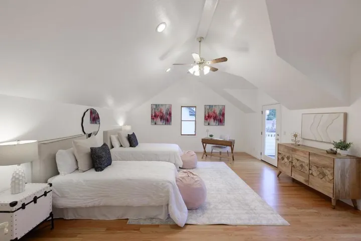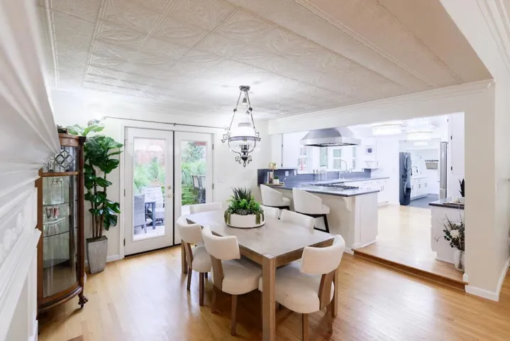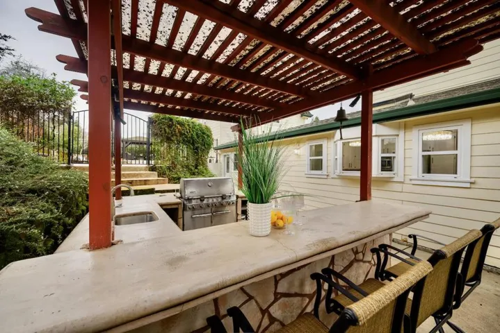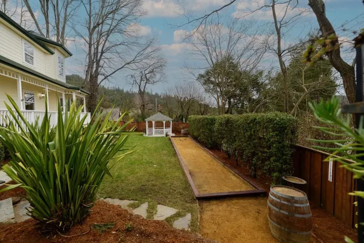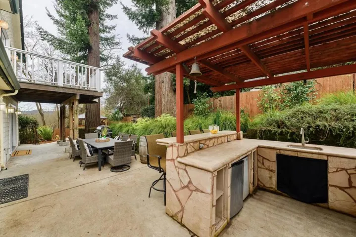 Exceptional Modern Farmhouse located just steps from charming downtown Felton, featuring a welcoming wrap-around porch and timeless architectural character. Inside, original vaulted ceilings with beautiful ornamental plasterwork highlight the formal dining room and family room. The updated kitchen offers Corian countertops, abundant white cabinetry, and an impressive 48 Thor gas range, with a convenient mudroom/laundry area and fully remodeled full bath nearby. The spacious living room is filled with natural light and enjoys peaceful views of the yard and surrounding mountains. The primary suite is a private retreat with a large walk-in closet, expansive en-suite bath with double jetted soaking tub, separate walk-in shower, and private balcony deck. The main home includes four additional bedrooms, including one with a balcony and others connected by a Jack-and-Jill bath. Above the garage is a large bonus room and additional bedroom with vaulted ceilings and a half bath. The outdoor spaces are ideal for entertaining with multiple zones including three gazebos, outdoor kitchen, bocce ball court, and a saltwater in-ground pool and spa with solar heating. A three-car garage plus two storage sheds provide ample space. Minutes to Hwy 17 for easy access to the beach or Silicon Valley.