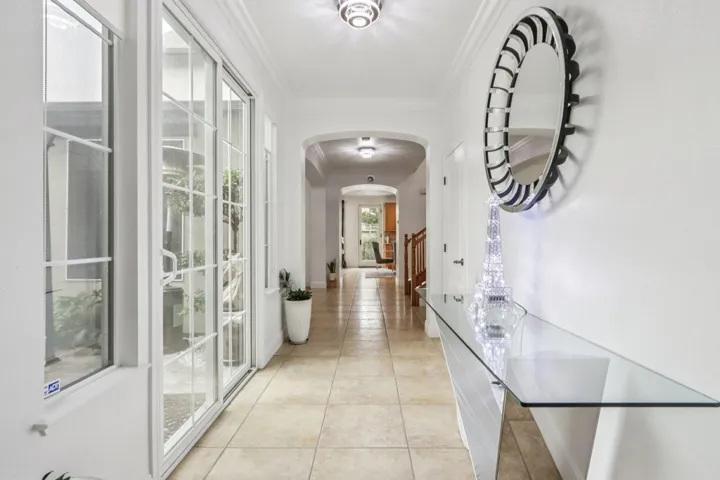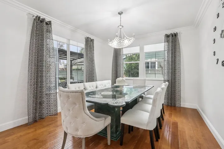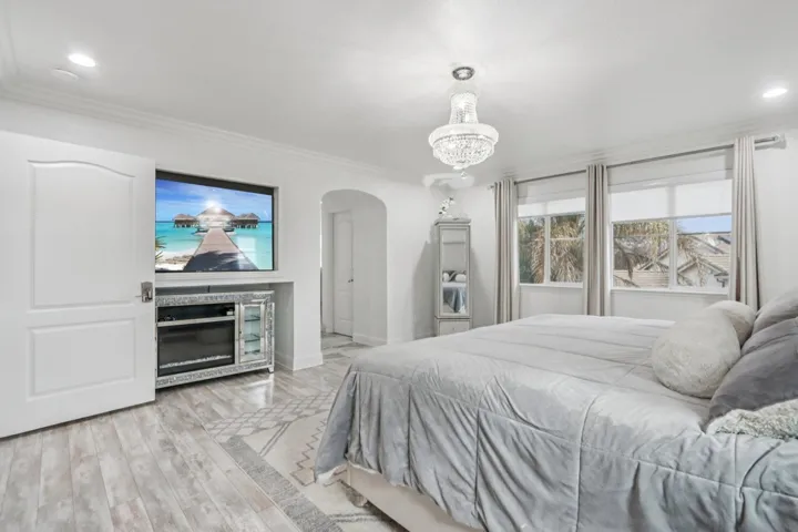 Beautifully upgraded custom home in a 24 hour gated community. Features include rich hardwood and tile flooring, crown molding, custom shutters, and an epoxy finished garage. All four bathrooms showcase premium tilework and designer fixtures. The layout offers formal dining, elegant living spaces, and a first floor BEDROOM with full bath. Additional highlights include a backyard workout area, state of the art water softener and filtration system, fully paid 22 panel SOLAR, crystal chandeliers, scratch resistant interior walls, and custom stonework in the front and rear yards. Comprehensive alarm and camera system included.Gym work out in back yard area