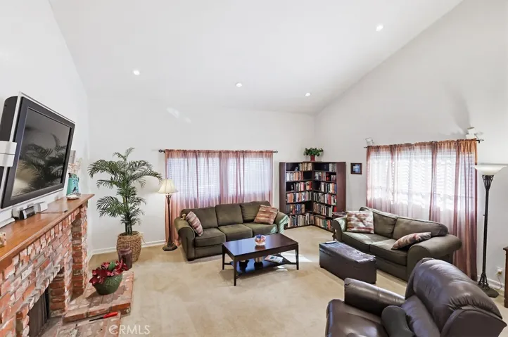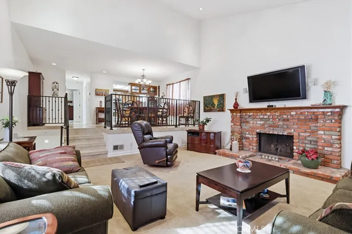 The second floor reveals a sun-drenched main living area defined by soaring vaulted ceilings, recessed lighting, and a cozy gas fireplace. A few steps above, the gourmet kitchen and dining area overlook the living space, creating a sophisticated open-concept environment perfect for hosting. This culinary hub is equipped with solid wood cabinetry, high-end beveled granite countertops, custom backsplash tiling, and under-cabinet lighting. Premium stainless steel appliances complement the high-end railing work and durable tile flooring. A thoughtfully appointed half-bath is conveniently located just off the kitchen to serve guests.