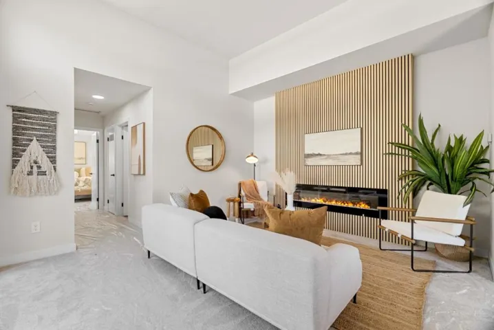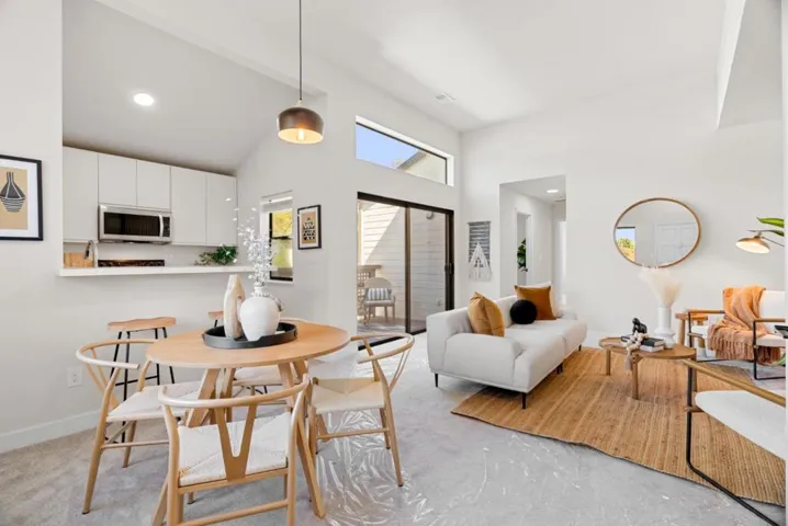 Imagine morning walks through Townsend Park, then coming home to your own light-filled sanctuary. This 2-bedroom, 1-bath condo isn’t just updated. It’s transformed. Soaring vaulted ceilings flood the great room and kitchen with natural light, creating an airy backdrop for daily life. The kitchen dazzles with quartz countertops and matching backsplash, sleek cabinetry, and waterproof flooring. The fully permitted bathroom brings spa-like luxury with brushed gold fixtures, a contemporary vanity, and luxury vinyl flooring. Your great room centers around a stunning custom feature wall with wood-slat accents and a built-in electric fireplace, pre-wired and ready for entertaining. Fresh designer paint, plush new carpet, sleek lighting, and premium finishes throughout mean you can simply unpack and start living. A rare dedicated laundry room inside, private balcony, and ground-level garage make everyday life effortless. Enjoy the community pool, nearby green spaces and courts, plus minutes to 101/880, SJC Airport, and Silicon Valley’s top employers. This one won’t last long. Come see what makes it special.