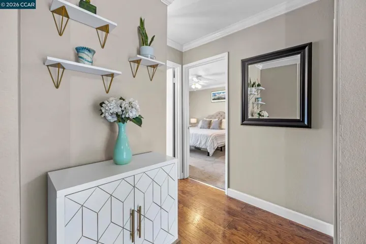 Welcome to this beautifully updated upstairs unit featuring 2 spacious bedrooms and 1 full bathroom. Inside you’ll find an open layout with tons of natural sunlight, beautiful hardwood floors and elegant crown molding throughout. The freshly remodeled bathroom adds a touch of luxury, while the in-unit laundry offers ultimate convenience. Both bedrooms include Elfa closet organizers, maximizing storage and functionality. Enjoy your morning coffee on the private balcony with peaceful views of the well-maintained grounds. This is one of the few units in the complex that offers this unique, serene view! Or take in the stunning scene of Mt. Diablo right from your front door. Conveniently located close to BART, this home is perfect for commuters or anyone seeking easy access to other parts of the Bay Area. It’s also just around the corner from Oak Grove and Countrywood shopping centers, offering a variety of grocery stores, restaurants, coffee shops, and retail options. With ample guest parking and thoughtful interior touches, this home blends comfort, style, and convenience in one perfect package. Don’t miss out – schedule your tour today!