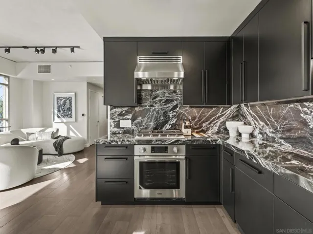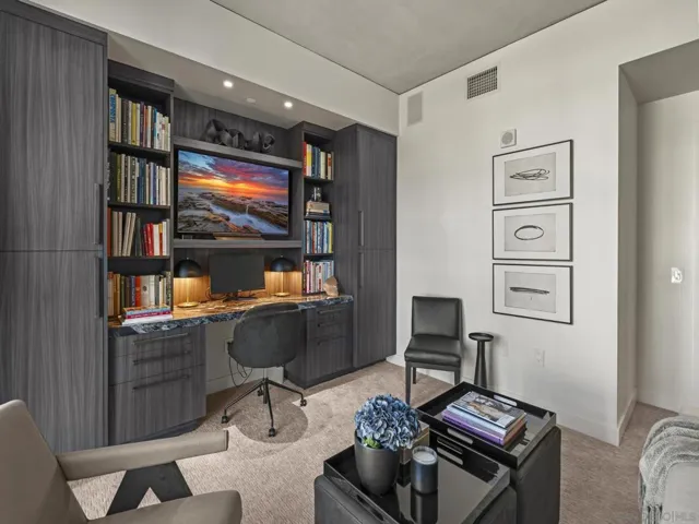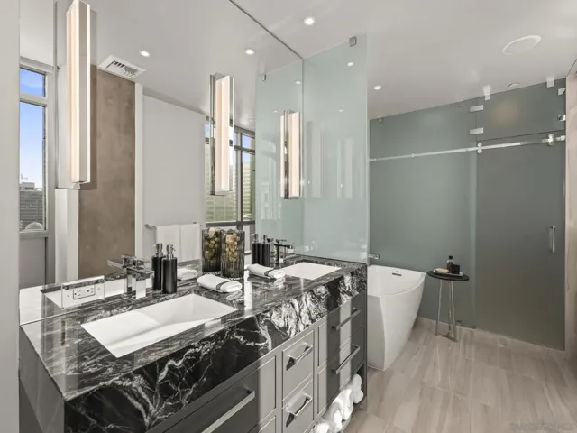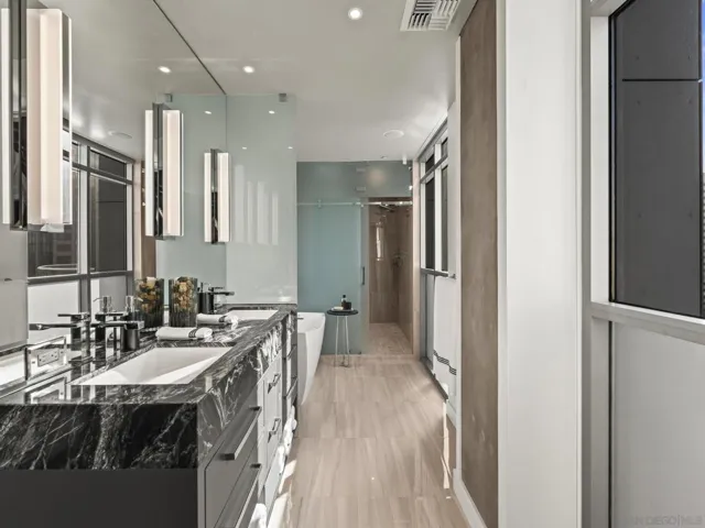 Imagine waking up in the heart of vibrant downtown, where every day is a new story waiting to unfold. This luxury residence at the Cortez Blu, an exclusive boutique building, isn’t just a condo; it’s a launchpad for an unparalleled urban lifestyle, perfectly situated just steps from Symphony Plaza, Balboa Park, Little Italy, and the Gaslamp. Step inside your eighth-floor sanctuary, a space totally redefined in 2024 to blend modern luxury with architectural distinction. The design choices are intentional and inspiring, featuring striking exposed concrete walls adding texture and an industrial-chic edge to high-quality finishes. You’ll find bespoke elements everywhere, from custom cabinetry with granite tops and high-end appliances to sophisticated designer lighting and hidden tech shades. The commitment to unique architecture extends to the bathrooms, which feature fixtures by legendary Frank Lloyd Wright. The primary suite is a true retreat, offering picturesque city views through floor-to-ceiling windows and access to a private balcony. The en-suite bathroom indulges with a dual custom vanity, soaking tub, wet room, and walk-in closet. But the real showstopper is the over 750 sq. ft. private view terrace—a rare, almost impossible-to-duplicate outdoor space that seamlessly transforms your living experience. It’s your personal stage for entertaining guests or simply soaking in continual, breathtaking city vistas. This turnkey property, complete with secure parking and storage, offers a lifestyle that is both sophisticated and thrilling in the pulsating center of the city. One must experience this residence to understand the feel and tranquility it brings. Enjoy the privacy of only 2 neighbors on your floor with only a small, shared wall. Perched atop the serene Cortez Hill, Cortez Blu offers the idyllic location in Downtown San Diego, coupling urban convenience with neighborhood charm. This location affords quick access to freeways, putting the entire city in easy reach, but near all the verve and excitement of the cultural and brimming nightlife, sporting events, and social happenings of the downtown area.