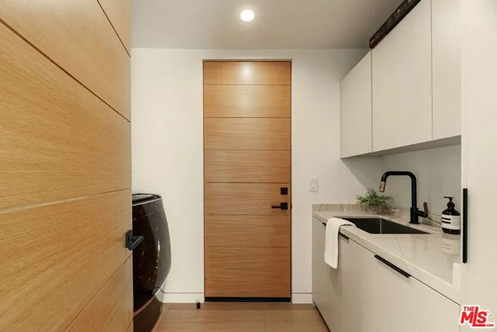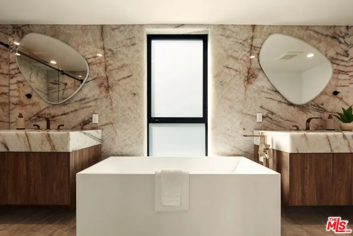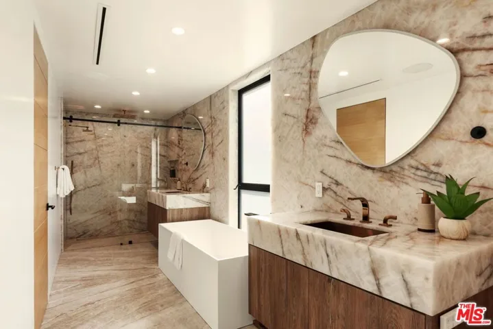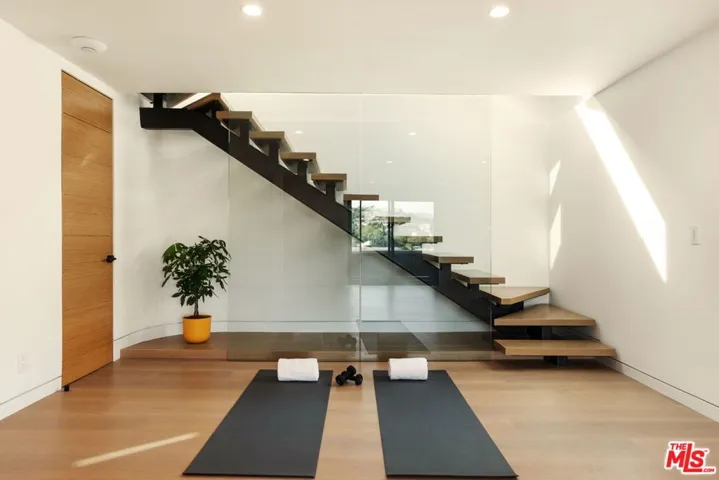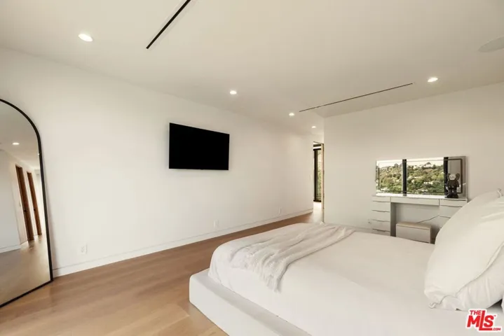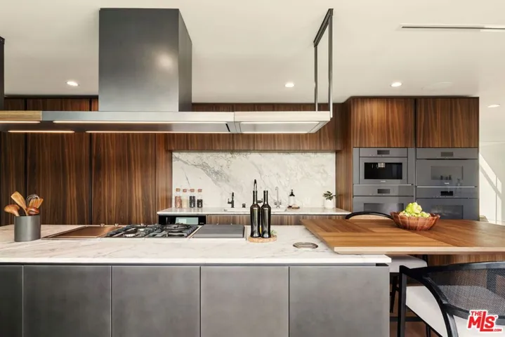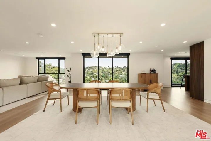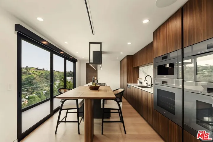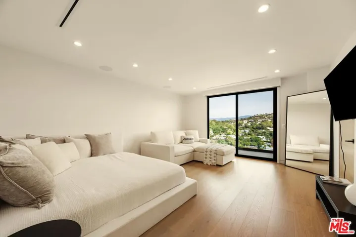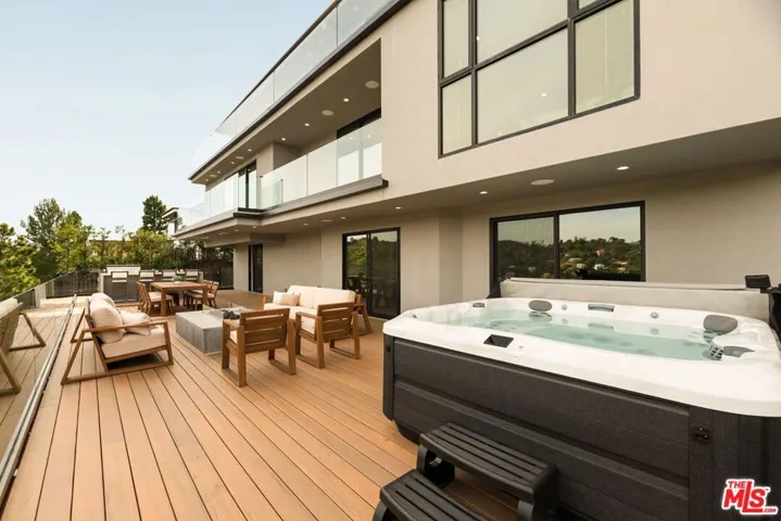 Located in the coveted Mount Olympus neighborhood of the Hollywood Hills, this completely remodeled 4-bedroom, 4.5-bath modern home offers spectacular city and canyon views in a serene setting. The open floor plan is designed for both everyday living and entertaining, featuring a gourmet kitchen with all Miele appliances, a built-in espresso machine, custom Italian cabinetry by Molteni & C, and Taj Mahal marble countertops and a breakfast bar for casual dining. The open floor plan includes a dining area and living room with a fireplace, opening to balconies offering views from every room. The downstairs level opens to a brand-new deck with a spa, fire pit, and outdoor kitchen complete with a built-in BBQ, cooktop, refrigerator, and new teak furnishings. There is a den/ office and a steam shower to use after a workout in your own personal gym. All main bedrooms are located on the top level – primary suite and secondary bedrooms feature custom walk-in closets, while spa-inspired baths include high-end stone finishes and heated floors. Additional highlights include real hardwood floors, built-in Sonos speakers, motorized Lutron shades, a workout room, movie theater/media room, security system, and two electric vehicle charging stations. Prime location in Los Angeles offering privacy and tranquility, yet just moments from the Sunset Strip and city conveniences.