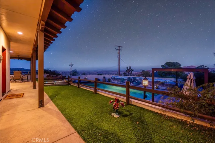 A homeowner’s delight nestled in the heart of Joshua Tree…Seeing is believing with this one-of-a-kind exquisite property. Built in 2013 this Mediterranean Style home offers over 2500 square feet of living space and is custom from floor to ceiling. Featuring renowned woodwork and cabinetry throughout every detail is placed with purpose and poise. An open split floor plan 3 bedrooms 2 baths, grand living room, craft room, a cooks kitchen indulgence, including a wraparound bar, island with prep sink, beverage refrigerator and a large walk-in pantry just to name a few. This property is flooded with natural light allowing the beauty of the desert to surround you and it doesn’t stop there! The home has multiple patios with handcrafted iron and masonry work, views that mesmerize and give you that retreat feeling you’re looking for along with a deluxe swimming pool complete with automatic cover, shade structure and is heated by solar. Pool is surrounded by a unique desert mural painted by local artist. Outside the Master suite a luxurious hot tub awaits you for those relaxing starry nights. A three-car garage is attached to a breeze way and gorgeous courtyard equipped with mature planters, overflowing flower beds and a trickling water fountain. Home is abundantly full of extra amenities such as instant hot water heater, water softener, outside icemaker, dog run, doggie door and more…Come make this desert property a reality and call Joshua tree Home sweet Home! Shown by appointment only.