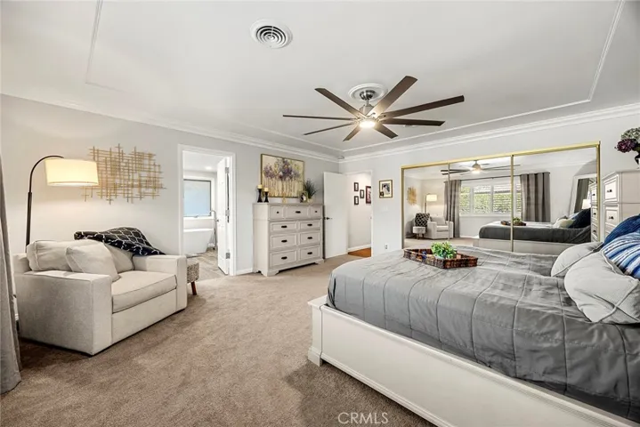 A private office with double doors, built-in shelving, and ceiling fan sits just off the living room. The fully remodeled kitchen boasts quartz countertops, breakfast bar, new cabinetry, pendant lighting, and stainless steel appliances, opening to a spacious dining area with serene backyard views. All bedrooms feature new carpeting and custom ceiling fans. The primary suite is a true retreat with mirrored closet doors and a beautifully remodeled ensuite featuring dual vanities, custom cabinetry, soaking tub, and separate shower.