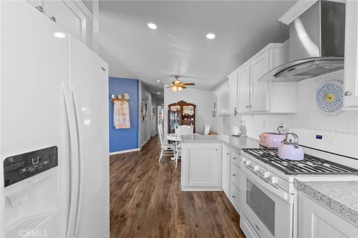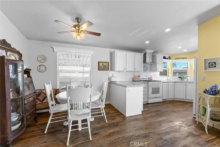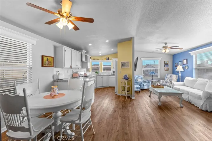 Welcome to this beautifully maintained 2019 manufactured home located in the quiet and highly desirable Bloomfield Mobile Home Park, a well-kept 55+ senior community known for its pride of ownership and peaceful setting. Offering approximately 1,344 square feet of living space, this move-in-ready home features an open-concept floor plan with high ceilings, abundant natural light, stunning laminate floors across the WHOLE HOME and tasteful accent colors throughout. The spacious living, dining, and kitchen areas flow seamlessly together, creating an ideal space for everyday living and entertaining. The kitchen is well-appointed with shaker-style cabinetry, tile backsplash, pantry, beautiful white appliances, corner sink with wraparound windows perfect for cooking or enjoying your morning coffee. Ceiling fans enhance comfort in the living room, dining area, and bedrooms.
