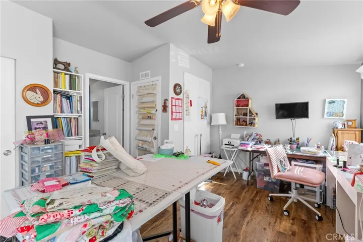 The primary bedroom which is HUGE and offers tons of wonderful natural light is currently being utilized as a craft and sewing haven, and offers a nice large closet, ceiling fan and a private ensuite bathroom featuring a walk-in shower, dual-sink vanity, and ample storage. The secondary bedroom also features generous closet space, ceiling fan and that amazing natural light. A separate indoor laundry room features extra storage and is conveniently located off the hallway. Central air and heating provide year-round comfort.
