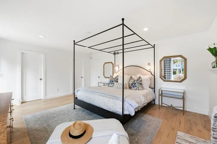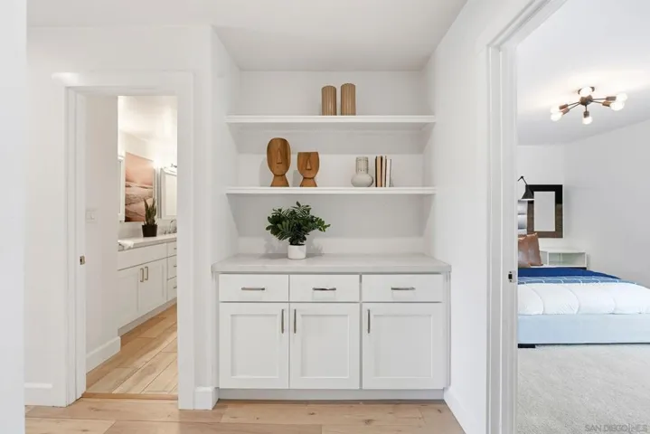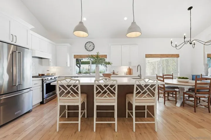 Welcome to a gracious interpretation of English cottage sensibility, this Encinitas Estates residence blends timeless beauty with effortless livability. Beautifully updated throughout, the home features custom window shades, rich hardwood flooring, dual-pane windows, and epoxy-finished garage floors, offering both refined aesthetics and modern comfort. The home unfolds across five generous bedrooms and three beautifully appointed baths, all anchored by a thoughtfully designed open floor plan that invites both light and connection. The main living spaces are flanked by oversized windows, allowing sunlight to pour into the living room, kitchen, and dining areas, creating an atmosphere that feels both luminous and serene. Every detail has been carefully considered, from the refined upgrades throughout to the seamless flow between indoor and outdoor living. On the lower level, a private bedroom and full bath sit just beyond a separate family room, offering an ideal retreat for guests or multigenerational living. Large glass doors open to a garden sanctuary where manicured lawns, climbing white roses, magnolia, and mature cypress trees frame a setting reminiscent of the European countryside. An awning shelters the terrace for al fresco dining, making the backyard a natural extension of the home’s warmth and charm. Encinitas Estates is one of the most beloved neighborhoods, known for its festive holiday spirit and close-knit community, this home offers a rare combination of timeless appeal, modern comfort, and an inviting setting for both everyday living & memorable entertaining.