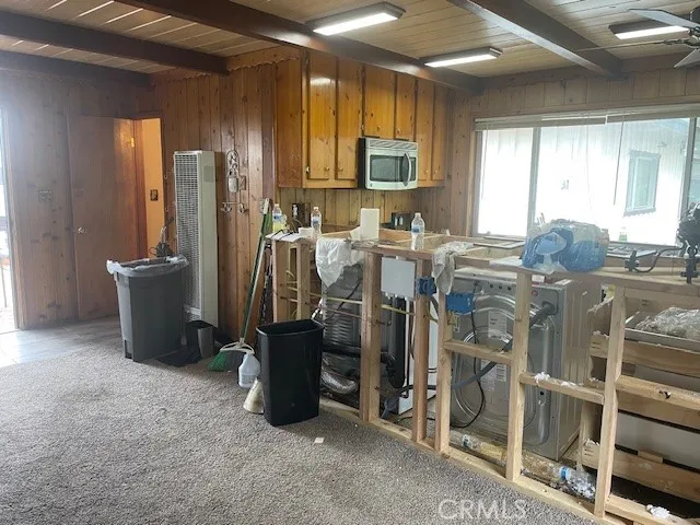country kitchen with knotty Cedar walls and ceiling. 36” stainless steel stove, dishwasher, washer and dryer. Large living