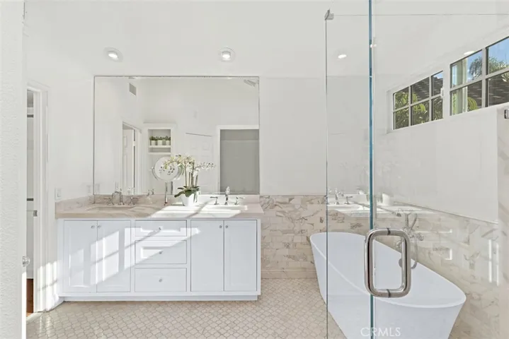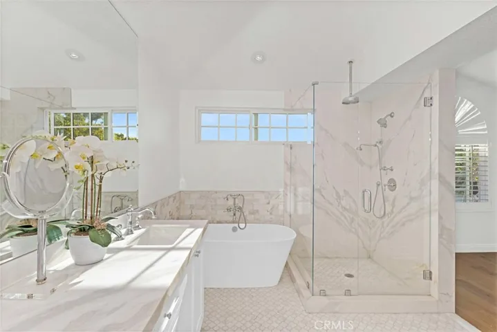 3 Del Perlatto in Irvine is where elegance meets grace!! This 3 bedroom and 3 bath home is situated on a park like and beautiful lot. Highlights include an exquisite and ever so classic chef’s kitchen with custom marble counters from an Italian quarry, high end appliances and designer fixtures. There is cathedral like ceilings in living and dining room with an elegant fireplace and picturesque windows overlooking a lovely outdoor patio and spacious backyard. Primary suite is luxurious with a stunning bathroom that takes your breath away featuring a Victoria + Albert soaking tub, Rohl fixtures and a lovely walk-in closet. Secondary bathrooms are all amazingly remodeled to the level of a 5 Star Resort matching the elegance of the home. Also included are an ever so desirable main floor bedroom and bathroom, stunning wide planked white oak wood flooring throughout and marble flooring in bathrooms. The home is in a desirable West Park neighborhood with the best Irvine schools and a very affordable HOA. The HOA amenities include pools, tennis courts and parks. Close to freeway access, John Wayne Airport, Fashion Island and South Coast Plaza.