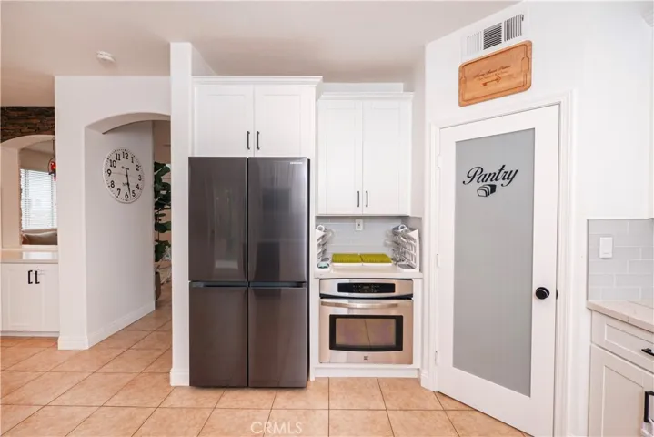 Inside, the home features a grand living room with soaring ceilings and Spanish-style tile flooring. The open-concept layout flows into a recently remodeled oversized gourmet kitchen with sleek countertops, stainless steel appliances, LED lighting, and abundant cabinetry.