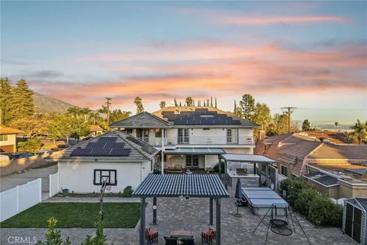 Welcome to your new home! Nestled at the foothills of prestigious San Antonio Heights, where Mt. Baldy’s snow-capped peaks create a stunning year-round backdrop—is a custom 4,451 square foot home with incredible curb appeal, timeless charm, and the backyard of your dreams. Walk through the front double doors to a sizeable foyer with soaring ceilings and a grand staircase that makes an unforgettable first impression. Natural light dances off the full mirrored wall in the formal dining room, complete with elegant French doors. Down the hallway you’ll find a bedroom with high ceilings and a ¾ bathroom, perfect as guest quarters or a home office. The large living room boasts an inviting fireplace and vaulted ceilings with plenty of room for family movie nights. Stylish recessed lighting has been added throughout key living areas, enhancing the home’s ambiance day and night. The informal dining room easily holds a table for 10 and sits just off the incredibly spacious kitchen—your home chef’s favorite room with its gas stove, endless cupboards, walk-in pantry, granite countertops, and breakfast bar. Just off the kitchen is an enormous bonus room that can hold a pool table on one end, with a ¾ bathroom and large office or 5th bedroom with wet bar on the other. With small modifications, it could serve as separate living quarters. Upstairs you’ll find two large bedrooms and a full bathroom with dual sinks for the kids. The exceptionally large primary suite features a fireplace, walk-in closet, dual sinks, glass shower, private toilet, and luxurious oval jetted tub. Each bedroom has French doors leading to a shared balcony with breathtaking mountain views. Recent upgrades provide peace of mind: a brand-new roof and new air conditioning units ensure lasting comfort through every season. The crowning jewel is the backyard. “Grey Haven” is an entertainer’s paradise featuring grey pavers, two manicured lawns, three organic garden beds, a large pergola, and an outdoor bar complete with Twin Eagles Grill and Perlick refrigerator. A stunning fountain sets the perfect ambiance, and the 13-foot swim spa seats nine. Custom landscape lighting transforms evenings into magic. This home also features a 4-car garage, leased solar, RV parking, and ¼ share water stock.