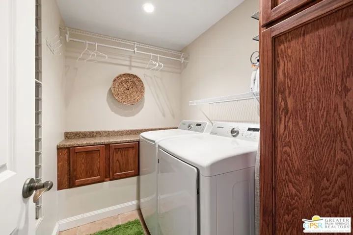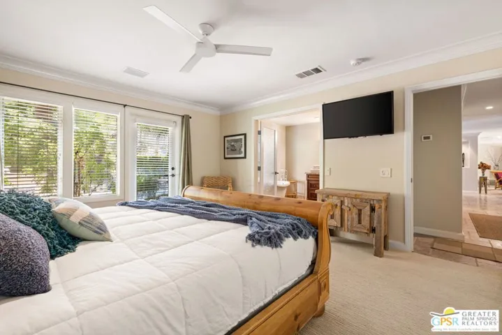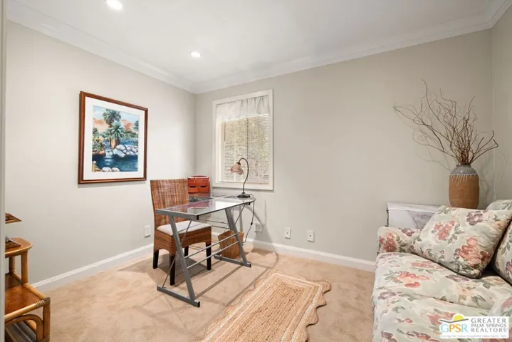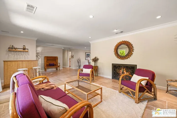 Surrounded by soaring mountains and poised beside Frank Sinatra’s favorite Palm Springs golf course and Walt Disney’s personal retreat, this Mediterranean Modern gem blends timeless elegance with modern functionality and seamless indoor outdoor living in the exclusive Indian Canyons neighborhood. Passing through the custom-crafted entry gate, you’re welcomed into a private front courtyard, an inviting setting for sunset cocktails or stargazing beneath bougainvillea, oleander, and mesquite trees. Beyond the rustic pecan wood door, a light-filled foyer with tumbled travertine tile flows into a comfortable living room with gas fireplace and pool-view dining and entertaining spaces. The eat-in kitchen features granite countertops, custom cabinetry, and gourmet indoor barbecue ideal for gatherings or entertaining. Beyond are two expansive patios, a Pebble Tec pool with tanning ledge, and a bubbling jacuzzi, creating an enchanting desert sanctuary designed for relaxation. The north wing hosts a tranquil primary suite with a spa-like bath featuring rainfall shower and classic clawfoot tub, opening to a secluded fountained alcove. A lovely second bedroom graces this wing, along with a versatile third bedroom or den showcasing artisan-designed built-in shelving. Across the hall, a beautifully appointed bathroom offers an oversized shower, handcrafted cabinetry, and vanity area. In the south wing, a well-appointed home theater awaits, complete with a recessed 80″ Aquos Quattron 3D TV and Denon surround sound. Nearby are a bright home office, a full-size laundry room, and two-car garage. Above it all, a 32-panel solar system delivers year-round efficiency and comfort through smart technology at a below-market lease rate. Whether envisioned as a full-time residence, second home, or luxury vacation rental, this 2,569-square-foot turnkey residence exceeds every expectation.