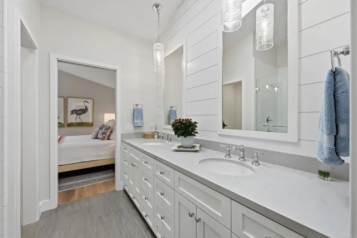 Coastal single-story living at its finest—just minutes from the ocean. Welcome to the highly coveted, gated community of Sea Cliff, where this beautifully upgraded detached single-level 2-bedroom, 2-bath residence is tucked away on a serene cul-de-sac and offers one of the most sought-after features in the community—a generous private driveway that accommodates two cars, a special and authorized convenience. Together, these rare attributes provide exceptional privacy, ease, and everyday functionality, all within a resort-style setting. Soaring ceilings and multiple skylights flood the home with natural light. Custom designer touches are woven throughout the home, with thoughtfully curated finishes, high-end materials, and refined details that elevate every space. The open-concept floor plan is designed for easy living and seamless indoor-outdoor entertaining. The inviting living room features a striking fireplace with decorative fire glass, a stylish shiplap accent wall, and custom built-in cabinetry—creating a warm, coastal-modern ambiance. Multiple sliding glass doors seamlessly connect the interior to a private rear wraparound patio, ideal for morning coffee, al fresco dining, or unwinding after a day at the beach. The chef’s kitchen is a standout, thoughtfully upgraded with high-end stainless-steel appliances including a 36″ Thermador cooktop with center griddle, custom exhaust hood, Thermador convection oven, and Samsung refrigerator and dishwasher. Quartz countertops, a Kohler farmhouse sink, custom cabinetry with a lighted China cabinet, and a Velux Low-E skylight complete this stunning space. Luxury vinyl plank flooring flows throughout, complemented by energy-efficient Milgard windows and patio doors. The serene primary suite features a shiplap accent wall, a beautifully upgraded bath with quartz counters, and a walk-in closet with a conveniently located washer and dryer. The secondary bedroom and guest bath are equally refined, with custom finishes, designer lighting, and thoughtful details throughout. Step outside to your private garden-style patio, surrounded by lush greenery—your own tranquil outdoor retreat for entertaining or relaxation. Residents of Sea Cliff enjoy resort-style amenities, including two pools and spa, tennis courts, a clubhouse, and scenic walking trails that wind around peaceful ponds and streams, all set within impeccably maintained grounds. Single-story homes near the coast in Carlsbad are rare—this is your opportunity to live the lifestyle you’ve been waiting for, with the beach, award-winning schools, top dining, and premier shopping just moments away.