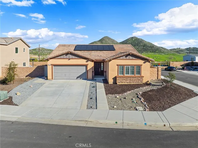 The large backyard offers a cement patio, lush green grass, and water-efficient decorative gravel and wood chips—perfect for entertaining, play, or quiet evenings outdoors. The rear and side yards are enclosed with block wall fencing, complemented by durable vinyl fencing on one side, designed for privacy and long-lasting durability. Enjoy beautiful mountain views that add to the peaceful and private setting. Paid-off solar system add exceptional value, energy efficiency, and affordability to this wonderful home.