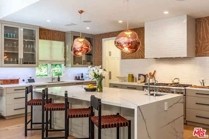 Step inside Wonderland on Wonderland, a storybook retreat and true hidden gem tucked away in one of Laurel Canyon’s most coveted and tightly held enclaves. Framed by mature sycamores, cascading greenery, and blooming white roses, this chic designer residence feels like its own private world from the moment you arrive, with a sense of calm and peaceful energy that carries throughout the property.Upon entry, custom hand-painted Porter Teleo wallpaper creates a striking first impression. Designed by Parlor Interiors and featured on the cover of California Home + Design, the home seamlessly blends elevated California style with timeless warmth. Vaulted, beamed ceilings and abundant natural light enhance the airy, welcoming atmosphere.The great room is the heart of the home, anchored by a dramatic custom green fireplace, warm oak floors, and a full wall of Fleetwood glass doors that open to the backyard, creating effortless indoor-outdoor living.Set on approximately half an acre, the grounds were beautifully landscaped by Brent Green of Green Art Landscape Design, offering a secluded hillside garden oasis complete with a sparkling tiled pool, wisteria-draped pergola, sculpted hedges, and a wood-burning pizza oven, ideal for entertaining or everyday enjoyment.Located within one of Los Angeles’ top-ranked public school districts and just moments from Wonderland Avenue Elementary, the home is well suited for families seeking privacy, a functional layout, and a strong sense of community. Finished with high-end materials and bespoke details throughout, the property strikes a rare balance of charm, character, and modern livability.Privately nestled yet minutes from the Sunset Strip and the best of the Hollywood Hills, this is a rare opportunity to own a truly special home in Laurel Canyon.