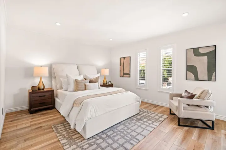 Welcome to 249 Elm Street #104, a light-filled and well-maintained 2-bd, 2-ba condo with an open layout & modern finishes in the heart of San Mateo. This 1,060 sq ft residence offers seamless living & entertaining with an open-concept living, dining, and kitchen area. The kitchen feat stone countertops, stainless steel appliances, recessed lighting, a breakfast bar, & ample cabinetry. The spacious living room is filled w/ natural light & opens to a private balcony, creating an inviting indoor-outdoor flow, w/ both bedrooms enjoying balcony access. The primary bedroom incl recessed lighting and an ensuite bathroom w/ a modern vanity & glass-enclosed stall shower, while the second bedroom is served by a hallway bathroom w/ a shower-over-tub. Addtl highlights incl in-unit washer & dryer, engineered hardwood & luxury vinyl plank flooring, fresh interior paint, LED lighting, & a high-efficiency gas furnace w/Nest thermostat. The unit includes one assigned parking space, additional storage, and historical use of a second space (buyer to verify with HOA). HOA amenities include a pool, elevator, and comprehensive maintenance, with the assessment for the new roof (2025) and elevator updates fully paid. Ideally located near Downtown San Mateo, Caltrain, shopping, dining, and Central Park.