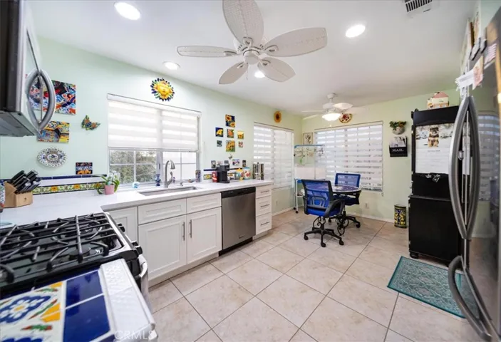 Welcome to the beautiful 55+ community of Palmilla on the Greens, located in the growing City of Menifee. This 3-bedroom, 2-bathroom single-story home offers 1,206 square feet of living space and is situated on a quiet cul-de-sac, making it well suited for an owner seeking privacy and a peaceful environment. The third bedroom, which has a double-door entry, could also be utilized as a den or office. The upgraded home includes a family room, a dining area, an eat-in kitchen, an indoor laundry area conveniently located in the hallway, and a two-car garage with storage. The family room features a gas fireplace, to include a new black tiled hearth and an overmantel decorative tiled surrounded mirror. The family room also has direct access to the backyard through a sliding glass door. The eat-in kitchen has been remodeled to include extended quartzite countertops, white cabinetry with pull-out shelving, ceramic tile flooring, recessed lighting, a newer microwave, and an imported Mexican tile backsplash that adds visual interest. The guest bathroom has been upgraded with a walk-in style tub and shower designed for easy access, as well as an upgraded vanity, mirror, and lighting. The primary suite bathroom includes an upgraded vanity with dual sinks, mirror, lighting, and elevated toilet. The primary bedroom also offers a customized closet and a sliding glass door with direct access to the backyard. The family room, dining area, hallway and primary bedroom had new waterproof vinyl flooring installed just last year. Owner has new vinyl planks that can be installed in the 2nd and 3rd bedroom before move in. The enclosed backyard, that includes a patio cover, enlarged patio with pavers, and beautiful new tropical landscaping, provides a comfortable outdoor space with portions of the fencing upgraded to vinyl. Additional features include ceiling fans in every room, indoor laundry for convenience, garage storage, and 18 leased solar panels that help reduce overall energy costs. The community offers two HOAs, the Palmilla HOA and the Menifee Master Association, for additional amenities and convenience. The Palmilla HOA offers social activities, clubhouse, pool and spa. The surrounding Menifee Master Association offers a bike path, and access to the lake and beach club.