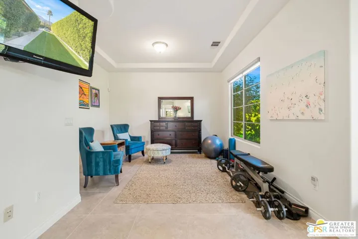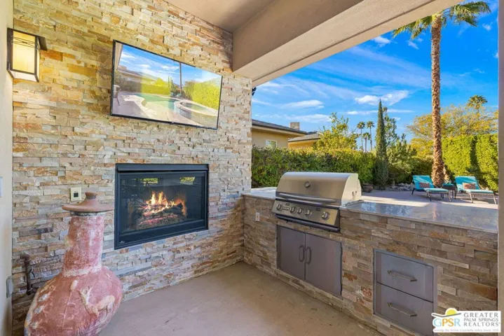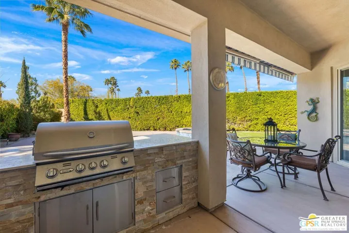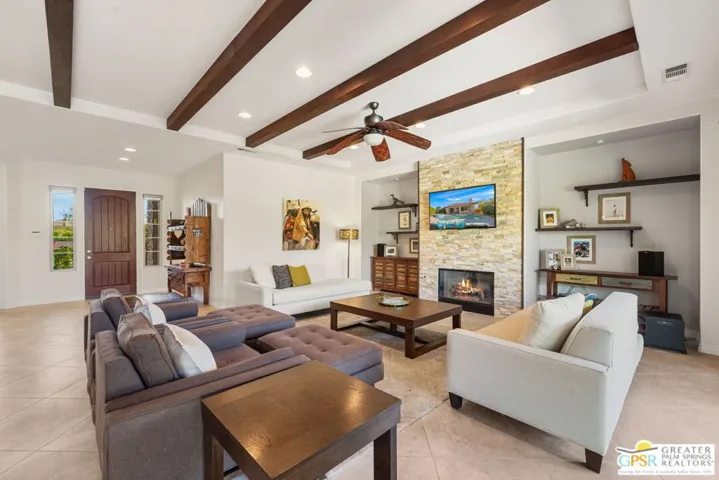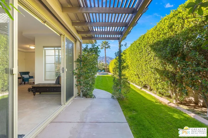 Enclave at Sunrise, an intimate private cul-de-sac of only 52 homes, this Residence Plan Two, completed in 2013 delivers refined Palm Springs living with privacy, scale, and Mountain views. The interior is bright and architectural with soaring beamed ceilings, designer lighting, tile floors throughout, and expansive glass sliders creating a seamless indoor-outdoor connection. A formal dining space anchors the layout and flows naturally into the main living areas. The kitchen is both functional and elegant, featuring rich wood cabinetry, granite countertops, stainless steel appliances, double ovens, and a large prep island. It opens to a dining area and a spacious great room centered around a fireplace. The primary suite is a private retreat with a sitting area, and a spa inspired bath offering marble countertops, dual sinks, soaking tub, separate shower, and a generous walk-in closet. A well-appointed en-suite guest bedroom provides comfort and privacy. An attached private casita with its own entrance offers flexible use for guests or a quiet home office. The backyard is designed for resort style living with a covered patio, gas fireplace, built in BBQ, retractable awning, and a pool with tanning shelf and spa. Mature landscaping, lawn areas, and tall ficus hedges create exceptional privacy, while a gated side yard with trellis detail adds both form and function. Elegant, understated, and thoughtfully designed, this home offers a Quiet Luxury Lifestyle in one of Palm Springs’ most desirable enclaves.