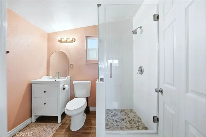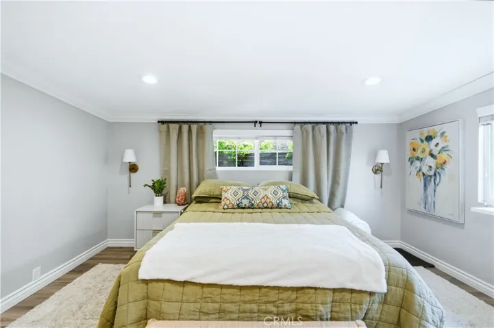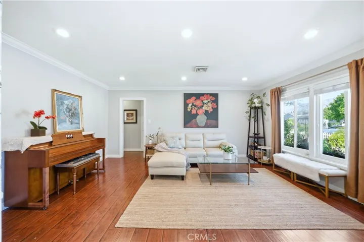 Located on a cul-de-sac street in Monrovia, this single-story property offers approximately 2,187 sq ft of total living space and includes an accessory dwelling unit (ADU). The main residence features three bedrooms and one remodeled full bathroom, along with both a living room and a separate family room. Interior highlights include hard-surface flooring throughout, crown molding, recessed lighting, dual-pane windows, and central air conditioning. The remodeled kitchen is centrally positioned and features white shaker cabinetry, stainless steel appliances, a gas range with vent hood, and a farmhouse-style sink, with easy connection to the dining and living areas. The ADU provides additional living space and includes a private living area with recessed lighting and a full kitchen with white cabinetry, and stainless-steel refrigerator, a separate bedroom, and a ¾ bathroom with walk-in shower and glass enclosure. Finished concrete flooring is featured throughout the ADU. Outdoor features include a covered patio, grass area, storage structure, and an above-ground spa. The long driveway provides multiple parking options, and the lot configuration allows clear separation between the main residence and the ADU. Conveniently located near local streets providing access to Monrovia amenities, parks, dining, and shopping.