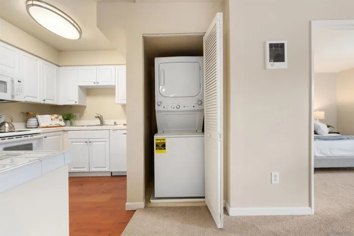 This terrific Del Cerro condo is located on the top floor of the complex. The unit features a wonderful open floor plan w/ split master suites, A NEW LARGE STACKED WASHER / DRYER IN THE LAUNDRY CLOSET & a good sized balcony which overlooks the pool. Among the many upgrades are fresh paint, new carpet, a wall AC unit, updated lighting fixtures and a new dishwasher. Please read the supplement for more! The complex is located close to SDSU, walking distance to the trolley and features a wonderful pool, BBQ area and plenty of grass to play on. Welcome home!
