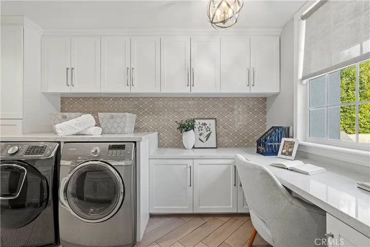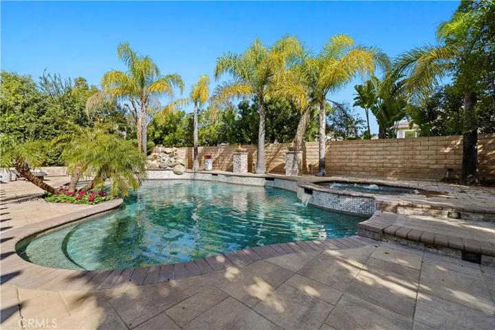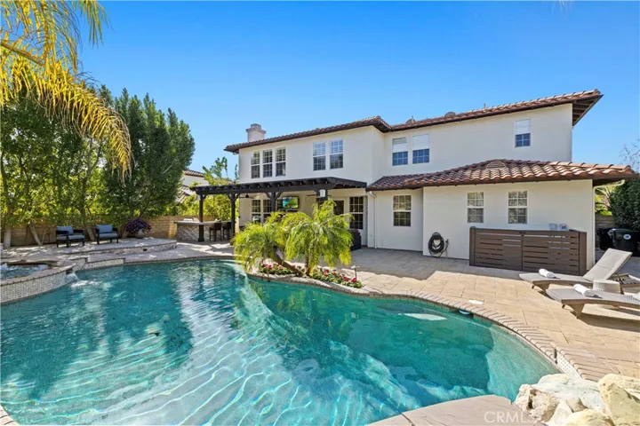 A RARE opportunity to own an exceptionally updated executive pool home with NO MELLO ROOS located at the top of a quiet, flat cul-de-sac in the highly sought after Torcello tract of Stevenson Ranch. This meticulously maintained residence offers approximately 3,773 sqft of living space with 5 bedrooms(plus an office) and 5 bathrooms on a nearly 10,000 sqft lot, designed for both comfortable everyday living and grand scale entertaining. The thoughtfully designed floor plan features high ceilings, abundant natural light, and hardwood flooring on the main level. The updated gourmet kitchen is a chef’s dream, showcasing stainless steel appliances, quartz countertops, custom backsplash, large center island, built in bar, wine fridge and butler’s pantry, and opens seamlessly to the spacious family room with fireplace. The main level includes a large dining room, bedroom with ensuite bath-perfect for guests, a home office, along with a powder room and extra large laundry room with utility sink that leads to the oversized tandem three car garage with custom built ins and EV Charger. Upstairs, a custom staircase opens to a wide landing with built ins, and three generously sized secondary bedrooms. The luxurious primary suite offers a private retreat and spa like bathroom featuring dual vanities, a soaking tub, oversized walk in shower, private water closet, and a large walk in closet. What truly sets this home apart is the resort style backyard! Designed as a private oasis, it features a custom pool and spa with new pool heater, pavers, BBQ area, fire pit and fire bowls, updated patio cover with outdoor heaters and fans, grassy lawn, and mature trees! Additional features include newer interior and exterior paint, crown moulding, new water heater, new window screens, an oversized driveway for additional parking or private recreational space and solar panels which offer significant energy savings. Located within the prestigious Stevenson Ranch master planned community, residents enjoy award winning schools, nearby parks, shopping, dining, and easy freeway access. And bonus! You are in walking distance to blue ribbon Stevenson Ranch Elementary School.