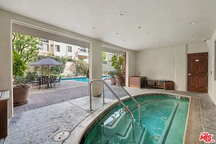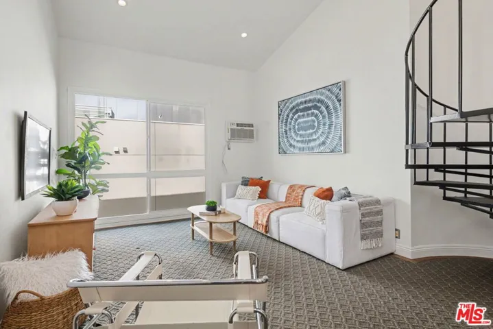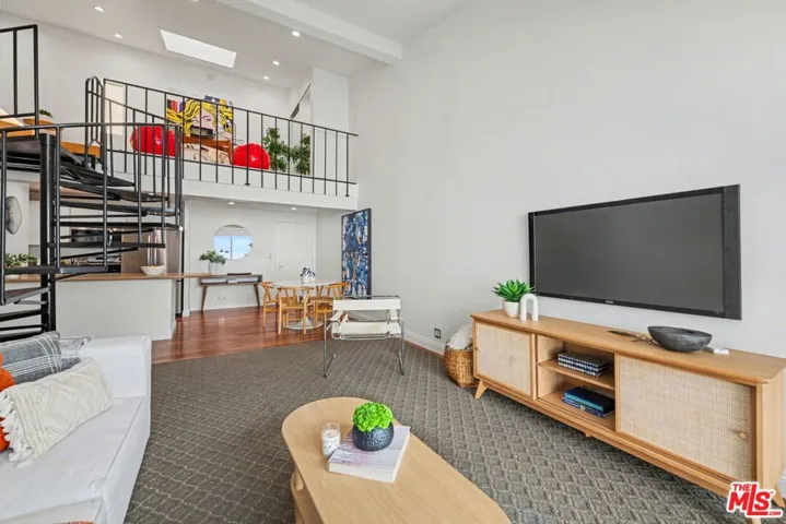 Desired Top floor 2 bed/1 bath corner-unit on quiet backside of The Colony at Westwood, with secured entry, updated pool/spa/gym/laundry, lounge and recreation room. 2 level unit with open floor plan that includes high ceilings, recessed lighting in living room, kitchen with quartz countertops, stainless steel appliance and breakfast bar. 1 bedroom on main level with 2 closets and updated full bath with floating sink and tile finishes. Spiral staircase leads to 2nd bedroom/open loft area with skylight and hardwood floors. Extra bonus space upstairs ideal for office/storage. Pets ok, secured 1 parking space in front garage, common area EV charging, common area laundry. Ideal proximity to UCLA and Westwood Village retail and restaurants, Westwood Recreation Center, Tennis and Park, Westfield Century City and Beverly Hills. Move-in ready!