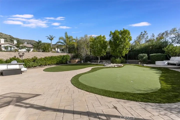 Located within the boundaries of highly rated Porter Ranch schools and set behind the guard gates of the prestigious Renaissance community, this exceptional single-story residence offers an open and airy floorplan enhanced by high ceilings, recessed lighting, abundant natural light, and refined architectural details throughout. The expansive kitchen is thoughtfully designed with generous storage, a large center island with seating and workstation, and a full suite of stainless-steel appliances including a double oven, 6-burner gas range, dishwasher, trash compactor, wine refrigerator, and microwave. The inviting family room features built-in shelving, large windows, and direct access to the backyard, while the formal living room, currently configured as a virtual golf simulation space, and form dining room provide flowing spaces for entertaining. The home offers 4 spacious en-suite bedrooms, including a massive primary suite with double-door entry, walk-in closet, and a spa-inspired bath with dual vanities, soaking tub, and glass-enclosed shower, complemented by a separate powder room for guests. A dedicated laundry room with extra storage and a 3-car attached garage with direct access enhance everyday functionality. The backyard is designed for both relaxation and recreation, featuring a built-in BBQ and gorgeous hardscape meandering between a spacious faux lawn with hot tub area and a custom putting green with raised seating area, all highlighted by lush mature landscaping and surrounded by stunning mountain views. The Renaissance community is known for its 24-hour guard-gated security, beautifully maintained grounds, and community tennis courts, while the location offers convenient access to shopping and dining at Porter Ranch Town Center, nearby hiking and outdoor recreation in the surrounding foothills, and nearby access to the 118 freeway. An ideal setting for everyday living and effortless entertaining, all within a serene, private enclave that captures the very best of Porter Ranch living.