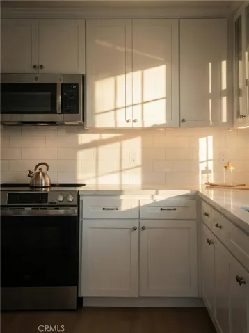 The modern kitchen showcases custom white shaker cabinets, quartz countertops, and brand-new stainless steel appliances, flowing seamlessly into the living areas. Both bathrooms are updated with matching quartz finishes, while luxury vinyl plank flooring throughout and carpeted bedrooms add comfort and warmth.