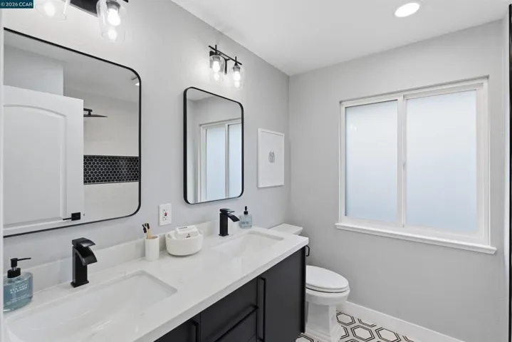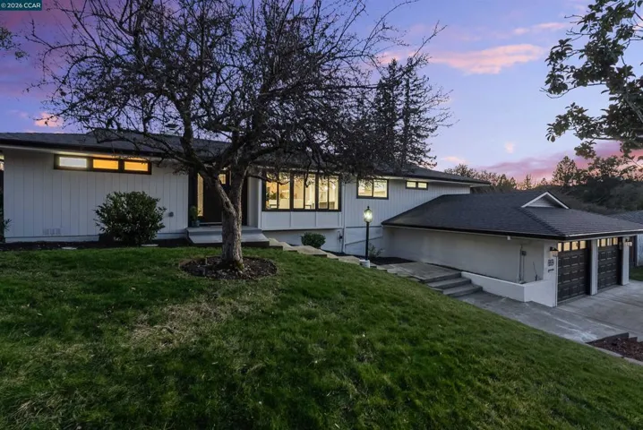 Experience elevated living in this beautifully remodeled 2,598± sq ft home offering five bedrooms and three baths in one of Moraga’s most desirable neighborhoods. The sun-filled living room features walls of glass, a striking stone and wood mantel fireplace, and seamless indoor-outdoor connection. The thoughtfully designed kitchen showcases white and gray cabinetry, quartz countertops, and sleek stainless-steel appliances and fixtures. Wide-plank engineered wood flooring, sophisticated interior paint, recessed lighting, and contemporary finishes enhance the home’s modern appeal. Expansive views extend from nearly every room, creating a bright and serene atmosphere. One level down, a spacious and versatile room provides flexibility for a family room, home office, gym, or guest space, complete with a private entrance to the backyard. Each bathroom is meticulously curated with designer tile, mirrors, fixtures, and lighting. Multiple outdoor spaces invite both entertaining and quiet relaxation, while the semi-private backyard offers a peaceful retreat. The finished garage features painted concrete flooring, and a separate rear storage area adds valuable functionality. Ideally located close to top-rated Moraga schools, parks, trails, shopping, and dining. Welcome Home!