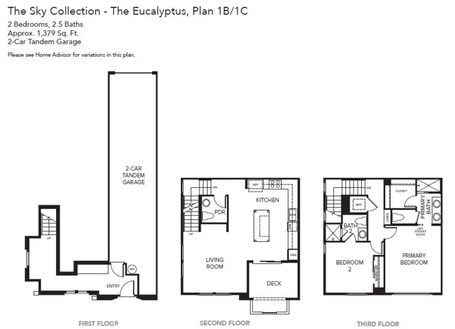 This thoughtfully designed “Eucalyptus” floorplan offers 1,379 square feet of living space, with 2 bedrooms and 2.5 baths. On the first level you’ll find an open entryway with a bit of storage space, and a large two car tandem garage. The second floor is your main living level and features a spacious kitchen with large eat-in island, an open living room and an oversized deck for outdoor living. On the upper level you’ll find a conveniently located laundry room, your large primary suite with walk-in closet and a secondary bedroom with private en-suite bath.