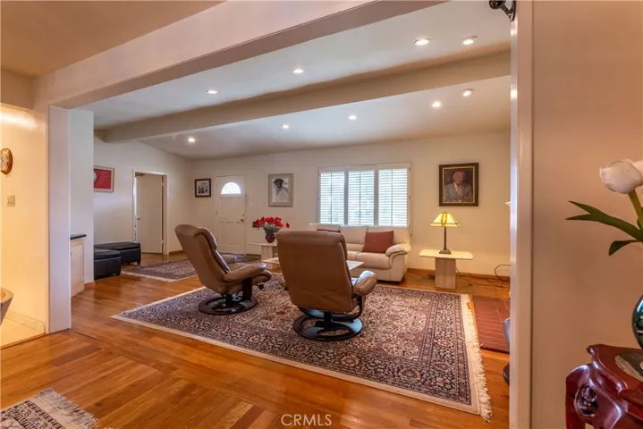 Beautifully appointed home in the highly sought-after East Long Beach neighborhood of La Marina Estates. This charming mid-century junior executive residence retains the iconic angles and architectural character of the original design, complemented by thoughtful modern updates and generous additions, including a spacious primary suite (2002), office (2001), and family room (2006). Gleaming hardwood floors and elegant travertine tile lead you through an open, light-filled layout. The vaulted living room features a cozy fireplace and a large picture window, seamlessly flowing into the dining area and expansive family room beyond. Just off the dining space, the office offers custom built-ins and a pocket door, creating a private workspace or flexible guest area. The kitchen opens to the dining area and showcases glass-front cabinetry, a walk-in pantry, and a five-burner range—perfect for both everyday living and entertaining.