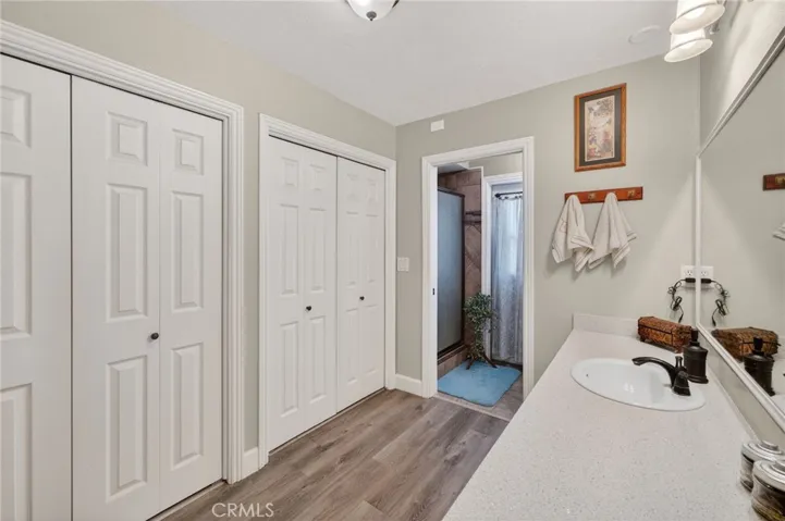 The kitchen offers ample storage including a walk-in pantry, while the bathrooms showcase tastefully accented tile showers. The spacious primary bedroom features dual closets, and all bedroom closets are equipped with lighting. Additional highlights include abundant closet space, a 40-gallon wall-mounted hot water tank that preserves garage floor space, and a two-car attached garage with laundry area, utility sink, and overhead storage. The expansive backyard is large enough to accommodate a pool, and also features mature pomegranate, lemon, and orange trees, offering both function and outdoor enjoyment.
