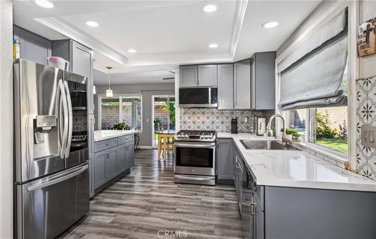 Welcome to your new home, nestled in a quiet and established cul-de-sac. This spacious 4-bedroom, 2-bathroom residence has been beautifully updated and is move-in ready. The open kitchen blends functionality and style, creating the perfect setting for everyday meals and effortless entertaining, complete with a convenient breakfast bar. The living room offers an open and airy feel, while the family room with fireplace and the dining area provide flexible spaces for relaxing, hosting gatherings, or creating a playroom or additional lounge space. The primary suite serves as a comfortable retreat, featuring two closets for ample storage and an en suite bathroom with a dual-sink vanity and updated finishes. Three additional bedrooms offer versatility for a growing family, home office, or fitness space. Step outside to a generously sized backyard with mature fruit trees, including lemon, orange, apple, and pomegranate. A large storage room attached to the home provides valuable extra storage. Whether enjoying a quiet evening outdoors or entertaining guests, this backyard offers endless possibilities.