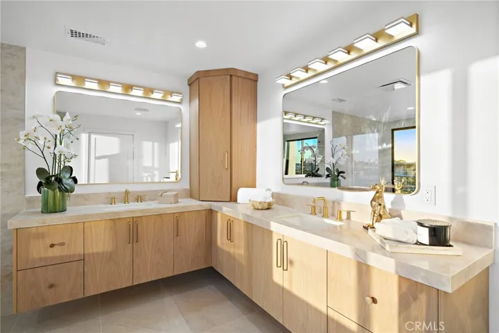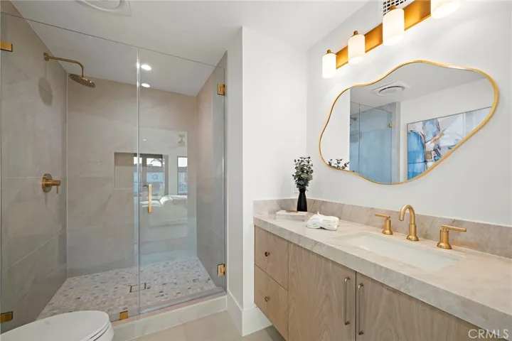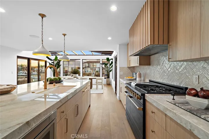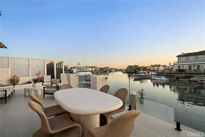 Stunning contemporary custom built waterfront residence located on Humboldt Island. Prime waterfront location with exceptional tri channel views. Encompassing 82 feet of expansive water frontage with a private 70-foot dock. Construction was just completed on this magnificent property that was taken down to the studs and completely rebuilt with all the finest finishes. As you enter the home you are greeted by a massive iron and glass pivot door that leads into the foyer with high volume ceilings. The beautiful water views are immediately in sight as your move into the living space with its open intuitive flowing floor plan. The Italian Bonelli bi fold doors stretch throughout the back side of the residence creating a seamless connection from the interior to the outdoor waterside deck. The great room style of this floor plan captures every inch of the waterfront views. Fabulous kitchen features a center island adorned with Taj Mahal quartzite counters. Rich white oak custom cabinetry with designer selected hardware offers ample storage and dual pantries. High end appliances featuring Thermador Freedom built in French door refrigerator and THOR Gordon Ramsey series double oven and range will be a true delight for the new homeowner. Rich white oak hardwood flooring complements the entire space in the home. Phenomenal glass domed dining area commands attention and features even more of the wide waterfront views. There is a convenient downstairs bedroom with en suite bath that can be utilized in many ways. Upstairs you will find the primary suite with its tranquil ambience. The views from the primary suite are amplified by the extensive window placements. There is a lovely sitting area and built in cabinetry with beverage center. The walk-in closet will be sure to accommodate all your wardrobe. The primary bath is sumptuous in design with a large soaking tub and a triple sized shower area. Custom white oak cabinetry and Lux quartz countertops. There are three additional bedrooms upstairs all come complete with en suite baths. The fifth bedroom is utilized as a bonus room which offers additional opportunity for relaxed and comfortable living. The waterfront deck area faces in a Southern direction and is sunny all day long allowing hours of enjoyment for living the Huntington Harbour Lifestyle!
