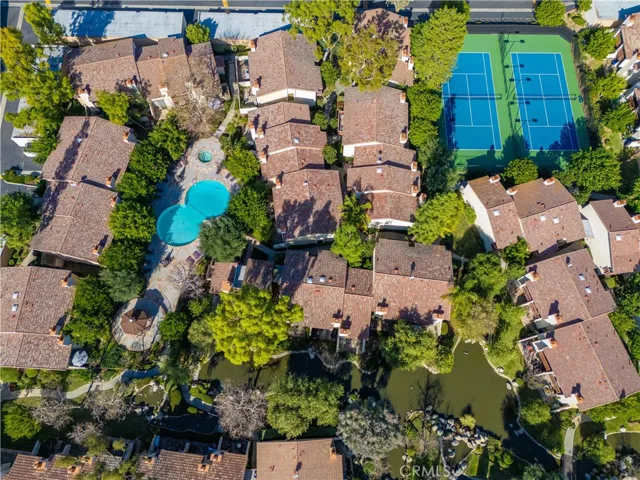 Additional features include a private two-car garage. The community offers desirable amenities, including a pool and spa, tennis courts, lush landscaping, walking paths, and peaceful meandering streams with fish and visiting ducks, creating a serene, park-like setting.