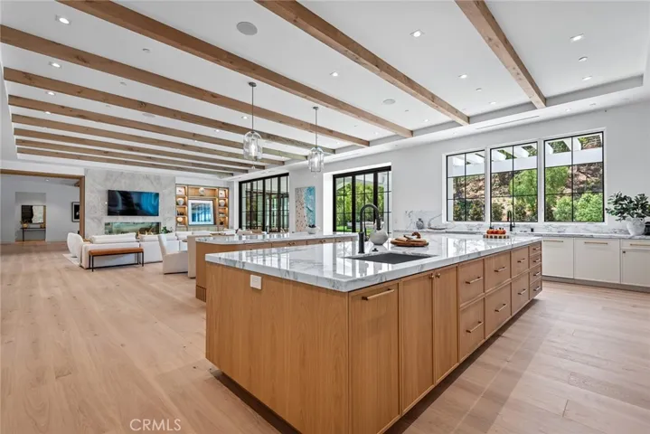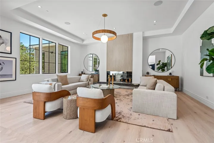 This brand new, recently completed, and absolutely gorgeous estate is nestled on a beautiful, lushly landscaped 1.4 acre lot. This home exemplifies the essence of the relaxed, indoor/outdoor California lifestyle and features luxury, elegance and excellent quality throughout. Bathed in natural light, and spanning 16,215′ (including the 931′ guest house), the spacious, open floor plan is highlighted by a restaurant quality chef’s kitchen with two islands, one with countertop seating, plus a big breakfast room, all opening to the large family room with sliding walls of glass, two-sided fireplace & adjoining lounge/game room with wet bar. Additional amenities include a spacious formal dining room with refrigerated wine wall, adjoining butler’s pantry, large private office with built-in custom cabinetry, stunning home theater with fabric covered acoustic sound walls, and a big gym & spa complete with steam shower, sauna, and sliding walls of glass opening to the rear grounds. There are six generous en suite bedrooms, four upstairs and two on the main floor. The superb primary suite includes a retreat, fireplace, deluxe bath with dual showers, big soaking tub, enormous, room sized custom closets, and a large private balcony overlooking the large backyard. The spacious grounds include a picturesque guest house, sparkling pool with large Baja shelf, family size spa, large covered patio, full barbecue center, a firepit with seating area, expansive grass lawns, mature trees, a circular driveway, and garages for four cars with gleaming epoxy floors. The home is also located on one of Hidden Hills’ most popular streets, with just a short walk to the community center with tennis courts, pool, and recreation room. It is also close to the highly regarded public & private schools, and the nearby, Commons shopping center.