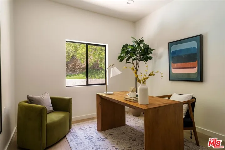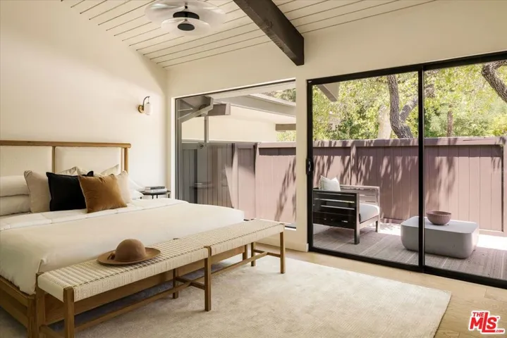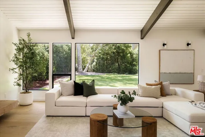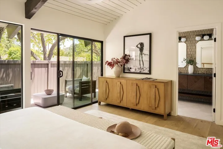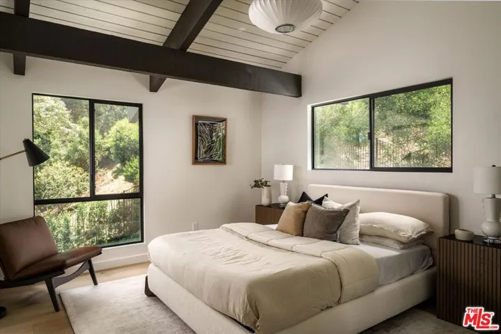 ALSO FOR LEASE AT $16,900 PER MONTH. Quiet and peace is what you’ll find tucked at the end of a long, gated drive on a generous flag lot in the Brentwood Hills section of Mandeville Canyon. This down-to-the-studs mid-century modern remodel is a study in quiet luxury and thoughtful living. Surrounded by hedges and flanked by your own private hillside, the property offers a sense of seclusion that’s rare especially just minutes from Sunset Blvd. Vaulted ceilings create openness throughout. Two bedrooms are on the main floor, including the primary with luxurious en-suite bath and its own private patio, perfect for a morning coffee. The second features its own en-suite bath, making it an ideal guest suite, home office, or creative studio. Upstairs, three additional bedrooms & 2 full baths, plus a loft-style den create space for work, guests, study, or media. The home’s scale is human, but the lot is expansive, allowing indoor and outdoor living to coexist with ease. Two large yard spaces create natural zones for entertaining. On the side, a wide flat lawn opens off the living and dining rooms, perfect for outdoor dinners, a volleyball or soccer game, or just relaxing. In the back, a totally renovated pool and patio connect to the kitchen and den, set against the hillside for added privacy. New systems including three zone HVAC, tankless water heaters, and appliances by Wolf, Cove, and Sub-Zero bring comfort and convenience, while wide-plank European oak floors and clean, classic finishes keep the look grounded and timeless in mid century detail. Designer finishes and thoughtful selections throughout reflect the care that went into crafting the updated version of the home. There’s ample parking both behind the gate and curbside on the neighborhood’s wide streets, where underground utilities keep sightlines clear and the environment uncluttered. For those who love the outdoors, the nearby Westridge Trailhead offers a local escape with canyon paths and sweeping ocean views, perfect for morning hikes, dog walks, or just clearing your head. Within the boundaries of highly regarded public schools (Kenter Canyon Elementary, Paul Revere Middle and Palisades High School) and close to some of LA’s most sought-after private campuses, this location blends the best of quiet canyon living with access to everything the Westside has to offer. Minutes from Amici, Brentwood Country Mart, the farmer’s market on Graetna Green as well as the shops on Montana in Santa Monica. Originally built as the model home for the neighborhood in the early 1960s and held by the same family ever since, it’s been expanded and reimagined for modern living. Though rooted in history, the home feels brand new. Only the mature trees, original MCM design, and wood-burning fireplace hint at the eras of days gone by. It’s truly the best of both worlds: classic mid-century Brentwood with all the comforts and confidence of new construction. Floorplan measured by Cubi Casa. Presumed accurate but not guaranteed.