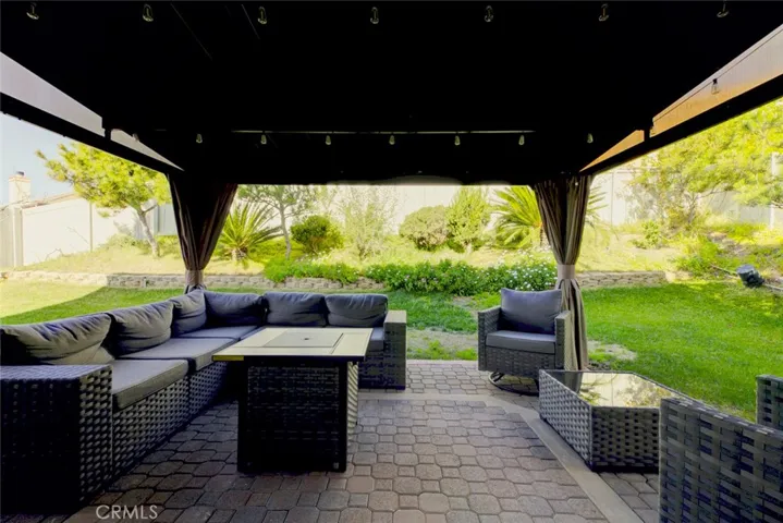 Step outside to your private backyard oasis featuring pavers, a covered patio, lush green landscaping, and vinyl fencing for complete privacy.
