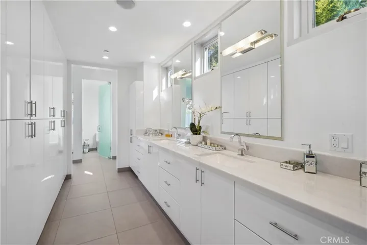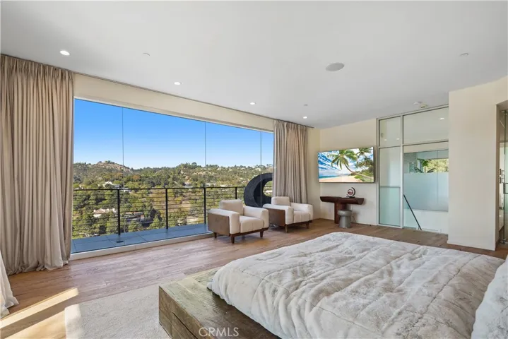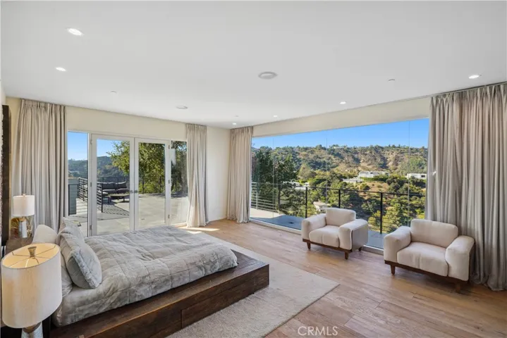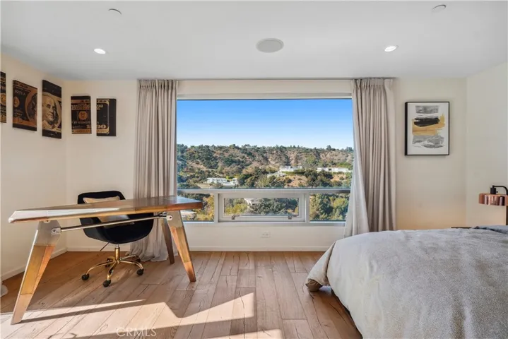 Suspended above the city within one of Beverly Hills’ most exclusive, celebrity-favored gated enclaves, 9716 Oak Pass Road is a striking contemporary estate offering exceptional privacy, architectural distinction, and breathtaking panoramic views. The community is gated, and the residence itself is further secured behind its own private gate and drive, creating a rare and dramatic sense of arrival. Spanning approximately 6,244 square feet across three dramatic levels, this modern sanctuary is wrapped in walls of glass that capture canyon vistas from nearly every room, delivering a seamless indoor-outdoor lifestyle throughout. A signature architectural highlight is the glass-enclosed skybridge hallway suspended above the infinity-edge pool, serving as a sculptural centerpiece on the main level and elevating the home to true statement-level design. The residence offers a total of four bedrooms, including an expansive and private primary suite retreat with commanding views, oversized walk-in closets, and a spa-inspired bath. Three additional guest bedroom suites provide exceptional comfort and privacy. Designed for both refined daily living and elevated entertaining, the home features a gourmet chef’s kitchen, sophisticated formal and informal living areas, a private executive office anchored by a dual-sided fireplace, and a dedicated private theatre/media room. Multiple view terraces and decks extend the living experience outdoors, while the floating infinity-edge pool appears to merge with the skyline, creating a resort-style setting high above Beverly Hills. Set among notable neighbors within an elite and discreet hillside enclave, this exceptional contemporary residence delivers a rare combination of privacy, prestige, and iconic architecture on one of Beverly Hills’ most coveted streets.