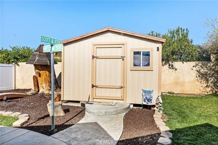 The backyard has been fully transformed with new perimeter walls and fencing, landscaped lawn with automatic sprinklers, a round concrete patio, solar pathway lighting, and a wood shed/man cave. Additional highlights include a 120V/30-amp RV hookup, RV clean-out, and wide gate access. Front yard upgrades include stucco improvements, decorative hardscape, irrigation, and a fountain feature.