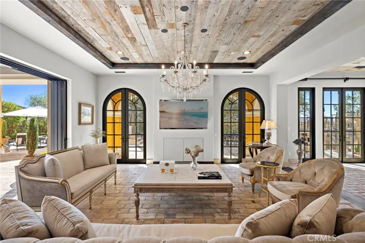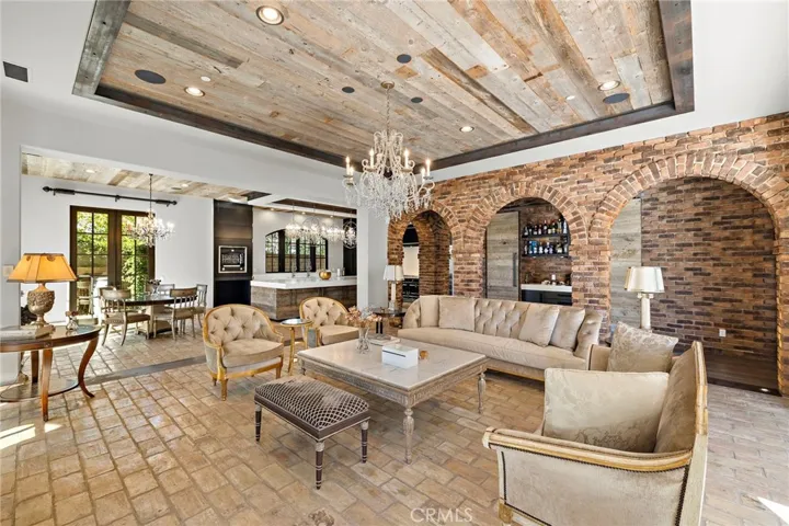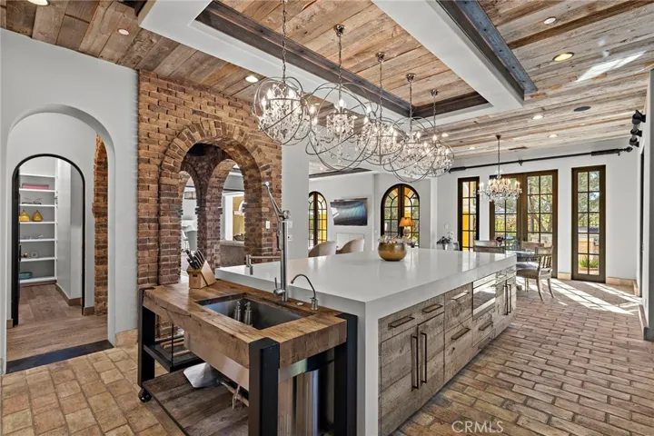 Spanning nearly 10,000 square feet, the home showcases reclaimed Old World flooring, soaring ceilings, dramatic chandeliers, and hand-crafted architectural details throughout. The chef’s kitchen is nothing short of spectacular, featuring a La Cornue range, ovens and rotisserie, dual Sub-Zero refrigerators, concealed refrigerated drawers, and a temperature-controlled walk-in wine room—perfectly suited for both grand entertaining and everyday living. The expansive floor plan offers six bedrooms, eight bathrooms, two private offices, home gym, an upstairs loft, and seamless indoor-outdoor living through dual pocket doors leading to a stunning entertainment loggia with a private fireplace and built-in heaters.