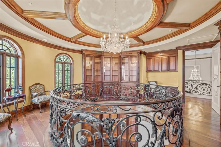 The first level of this palatial residence features a magnificent two-story circular library, an elegant formal living room with a cozy fireplace, a grand staircase that invites you to explore further, a family room with a fireplace to unwind in, a convenient laundry room, a bar area complete with a wine cooler, an elevator for seamless accessibility, a guest bathroom, a generously sized bedroom with an en-suite bathroom, and multiple patio areas beckoning you to bask in the serene ambiance. Among these outdoor spaces, one opens up to reveal a dazzling pool and spa, surrounded by majestic mountains that create an awe-inspiring backdrop. Ascending to the second floor, you will discover three stately bedrooms, each boasting its own bathroom adorned with jetted tubs for unparalleled relaxation. Expansive walk-in closets feature custom-built wooden organizers, catering to your every storage need. Private balconies offer a personal sanctuary, while a dedicated media room provides an immersive entertainment experience. For an unrivaled vantage point, step onto the magnificent covered balcony and revel in the awe-inspiring sunrises and sunsets that paint the sky in vibrant hues.