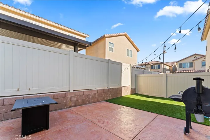 Step outside to a low-maintenance backyard featuring custom stamped concrete, artificial turf, and vinyl fencing—a perfect setting for family gatherings and weekend relaxation.