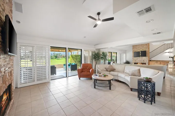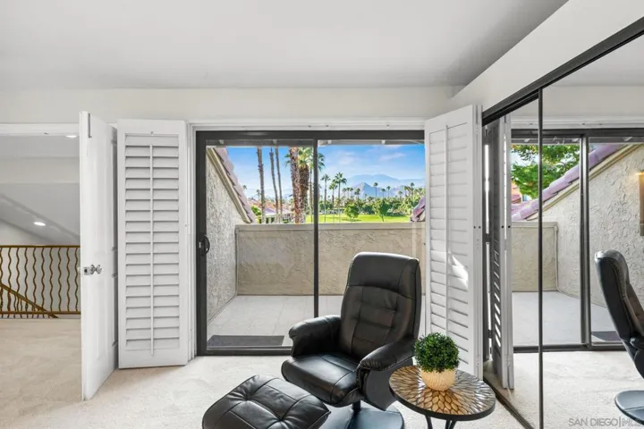 Welcome to your slice of paradise in The Woodhaven Country Club. Wake up to peaceful mornings and beautiful evenings on your private patio overlooking the 18th tee box and beautiful panoramic views of the mountains and stunning sunsets. This home is move in ready as a primary residence or a seasonal home or rental and is excellent for entertaining! Home was just updated with new paint, carpet, and ceiling fans. New light fixtures in the dining area and a freshly painted patio cover as well! Downstairs ensuite has the atrium converted to a spa style bathroom with dual showerheads, double sinks and upgraded bathtub. Optional 3rd bedroom, office or den downstairs as well with half bath and laundry closet. Open light and bright living area with granite countertops, stainless steel appliances, custom rock fireplace and double sliders to patio. Upstairs ensuite has a private balcony overlooking the golf course with stunning views! Enjoy the benefits of solar panels and a back up battery as well! This community has one of the lowest HOA fees in the desert which includes premium cable and internet services, water, trash and landscape maintenance as well as 4 pools and hot tubs, golf, pro shop, game room, tennis, pickle ball, fitness center, restaurant and lounge and banquet facilities. This amazing golf course is a semi-private course open to the public and boasts pristine lakes and gorgeous waterfalls with plush fairways and finely manicured greens. This property is turnkey and a must see!