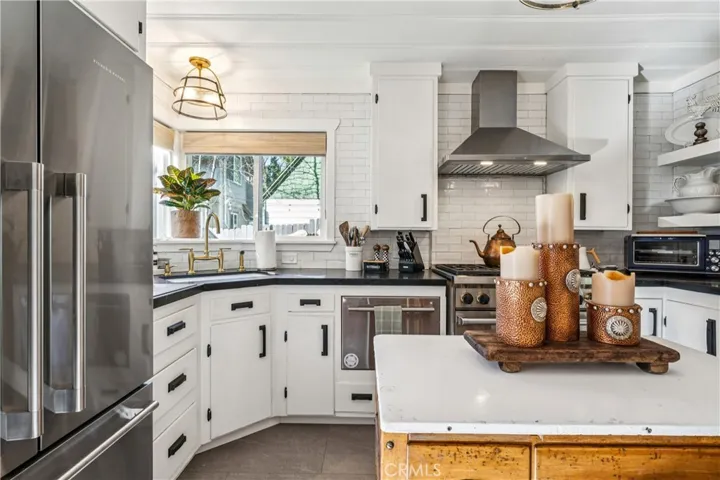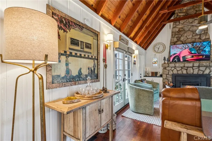 A MUST SEE in the coveted Palisades area! Exquisite, designer inspired and completely remodeled 1932 vintage cottage. Thoughtfully blends modern conveniences with timeless charm and authentic details. Enjoy level access to the home from the large, multi-car driveway onto the new deck and a warm, welcoming entry. The striking great room boasts an original, refurbished, locally sourced granite fireplace soaring two stories and includes a new wood-burning insert. Original, refurbished Douglas Fir hard wood floors add soul and character while vaulted beamed ceilings create a majestic, spacious vibe. A reconfigured floor plan provides an open-concept, seamless flow throughout the home. Awaken your inner chef in the upscale custom kitchen, with all new appliances and designer finishes including a Wolf professional range, while serving guests in the adjacent dining room. This main level offers the large ensuite primary bedroom and spa-like bathroom, and includes a gas log river rock fireplace and walk-in closet, as well as a secondary bedroom and adjacent full bathroom. Enjoy the convenience of an interior, first floor laundry room with new appliances and storage. Upstairs, overlooking the living room, you will find a romantic bonus/flex space currently utilized as a spare sleeping area and home office. Also, upstairs you will find the 2nd of 2 master ensuites which can be a separate retreat area. The property has a rare, oversized insulated and drywalled 1-car garage, excellent for your vehicle along with plenty of room leftover for a workshop and storage. The professionally designed landscape includes drip irrigation, a full planting pallet, and dogwood trees creating a lush mountain garden bursting into life in the Spring. You’ll find serenity in the fenced back yard with a lovely bonus “she-shed” with sink. New smart home features are incorporated throughout the home. Other upgrades include a new electrical panel, full alarm system and cameras, new A/C, a carefree whole-house 18kw Generac generator, new plumbing and electrical, designer finishes throughout, interior & exterior paint, new carpet in bedrooms, window replacements, and more! Conveniently located across the street from the local favorite Mountain Coffee, along with other dining, shopping and services – and you have Lake Rights! This home is on the short list for the 2026 Lake Arrowhead Home Tour and is not to be missed, come see for yourself! View by appointment only.