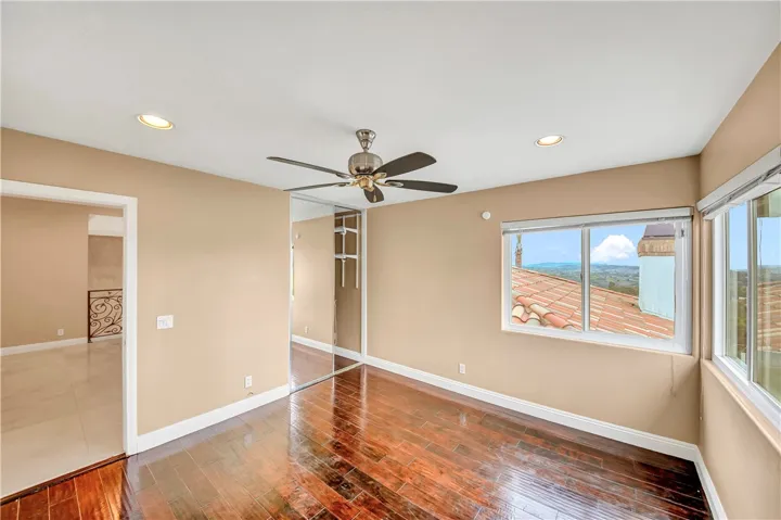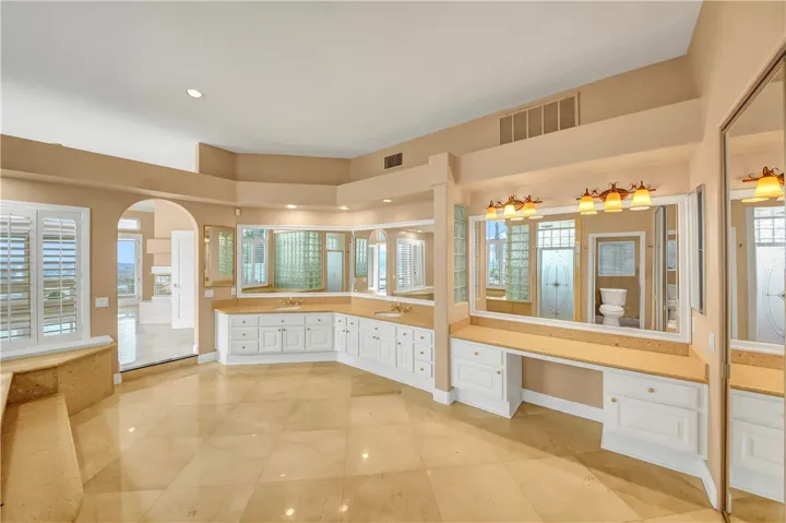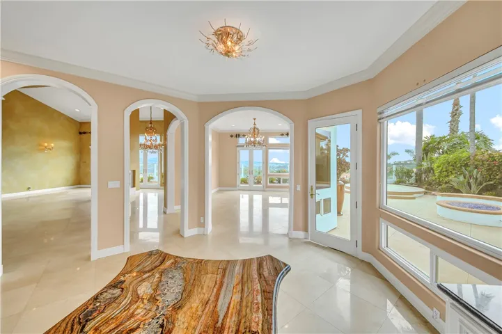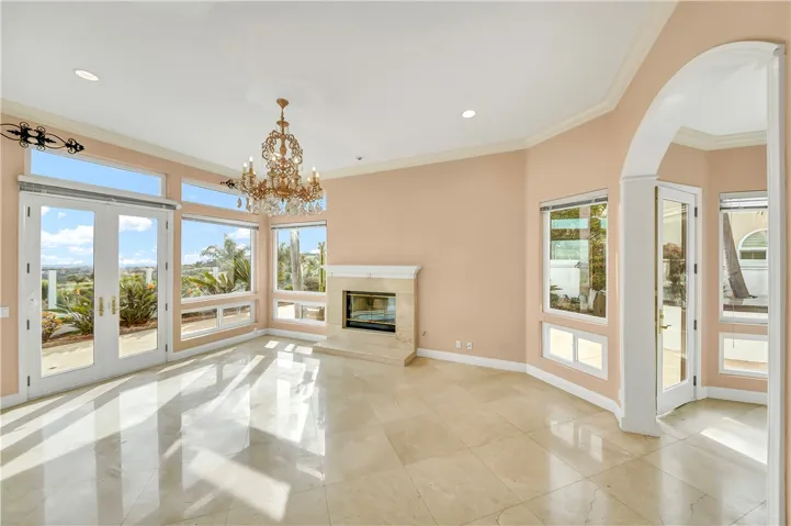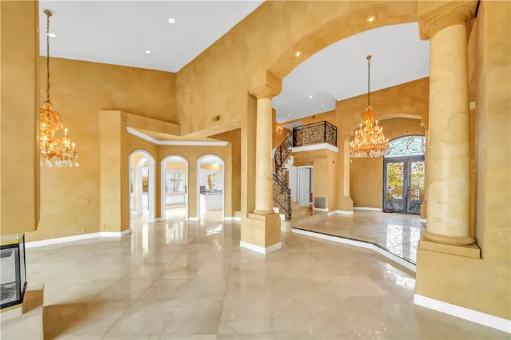 A dramatic two-story foyer welcomes you with imported Italian marble flooring, elegant wrought-iron staircase railings, and expansive sightlines through the main living areas, immediately highlighting the home’s exceptional views. The main-floor primary suite is a private retreat, offering a spa-like bath, fireplace, and direct access to the backyard and resort-style pool area.