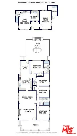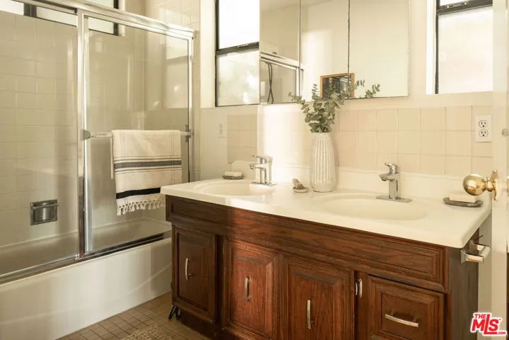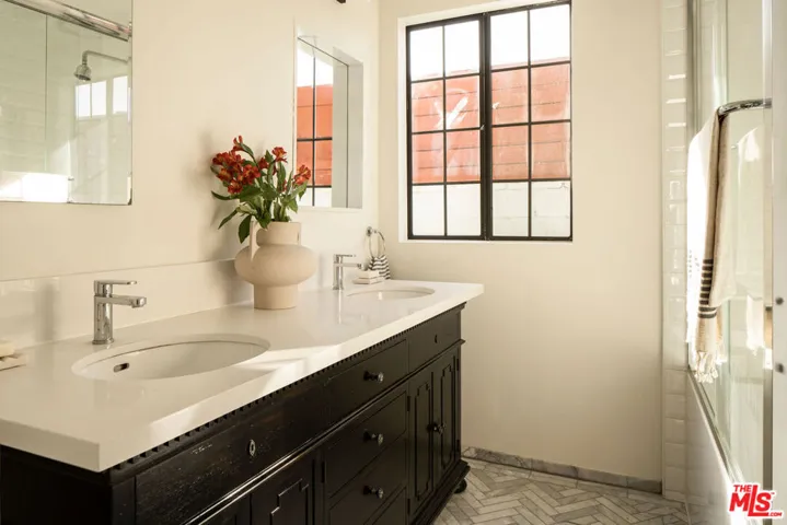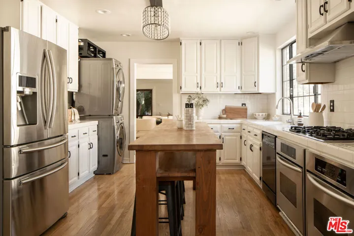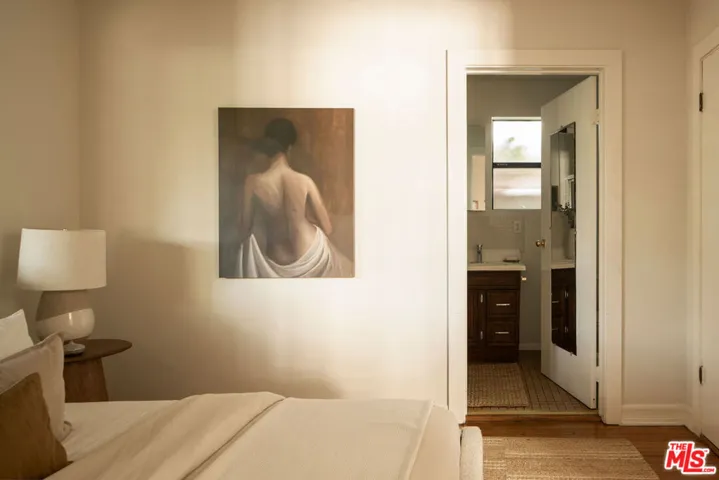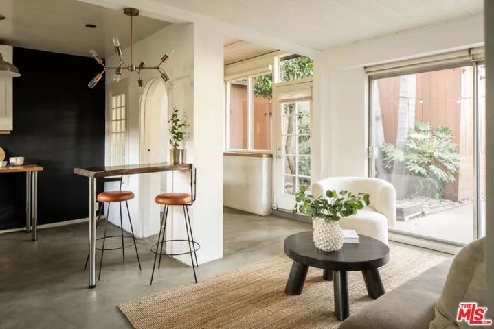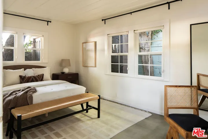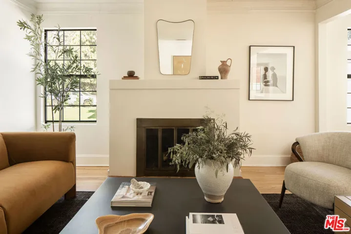 Sunset Square Spanish Hedged + Gated Retreat with lush landscaping, 4 beds + 2 baths in the main house & a 1 bed/1bath back house in the yard. Front courtyard outdoor living room has a stacked tile waterfall flanked by majestic banana trees and surrounded by mature plants. A covered patio and a wide character screened front door takes you into the home. A spacious living room with (decorative) fireplace opens to the dining room, all bathed in sunshine. The kitchen has double sinks, double convection ovens, and a high butcher block island that doubles as a breakfast bar. The kitchen has a stacked washer dryer and it opens to the breakfast room. The 2 bedrooms at the front of the house share a remodeled bathroom off the hallway with a handsome wood double vanity that has 2 sinks and lots of storage & a bath with shower. There are 2 additional true bedrooms at the back of the house – one is an en suite bedroom and the other is currently staged as an office. The house has central HVAC, new copper plumbing, newer water heater, hardwood floors, and a long driveway with tandem four car parking. There’s an outdoor patio at the back of the house with a wood deck + a soaring pitched ceiling overhead + an outdoor fireplace – it offers so much space for both dining and living. On the back property line is a spacious & private one bedroom apartment back house that has a foyer, living room, eat-in kitchen, bedroom and full bathroom. The location is prime, near coffee shops, Trader Joe’s, Bristol Farms, open-air restaurants, and world-class nightlife on Sunset. Lush landscape throughout includes soaring swaying palm trees, fruit trees, ficus trees, and more. Truly feels like a relaxing green compound oasis right in the heart of the city!